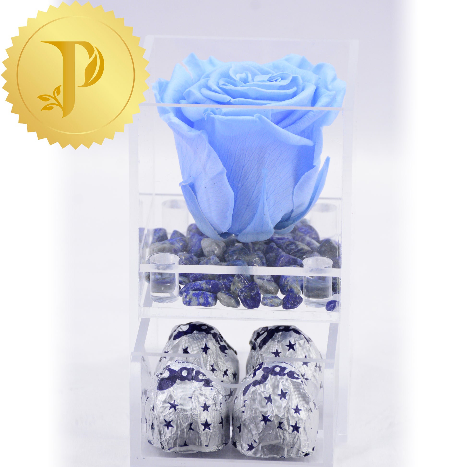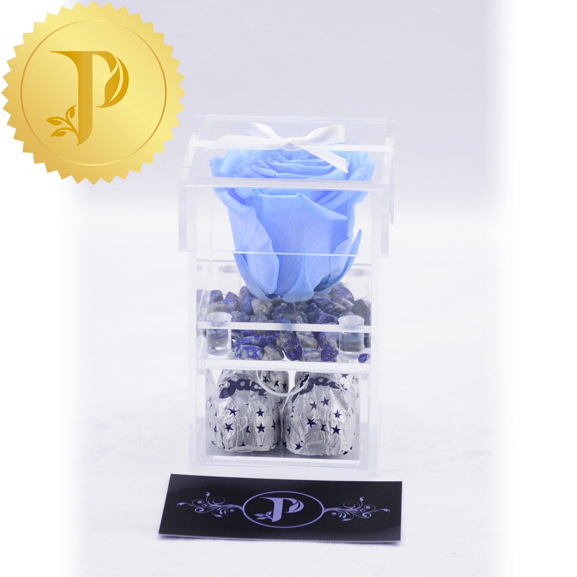 This single light blue rose in acrylic is complemented by a layer of the stone lapis lazuli, and a drawer filled with four Baci chocolates to enjoy. Lapis Lazuli is known for it’s soothing and comforting properties.