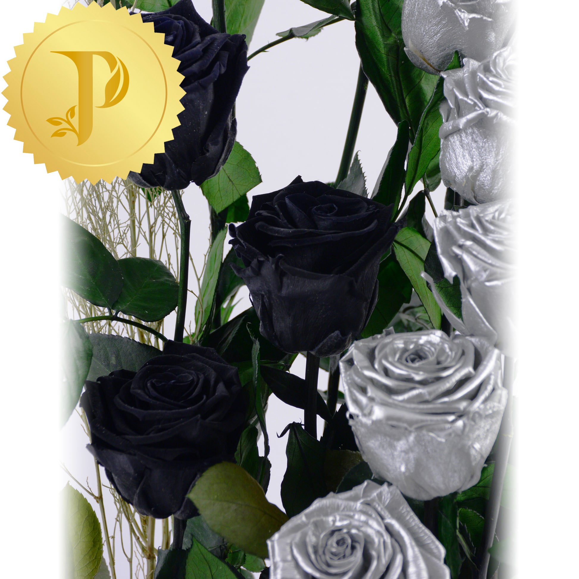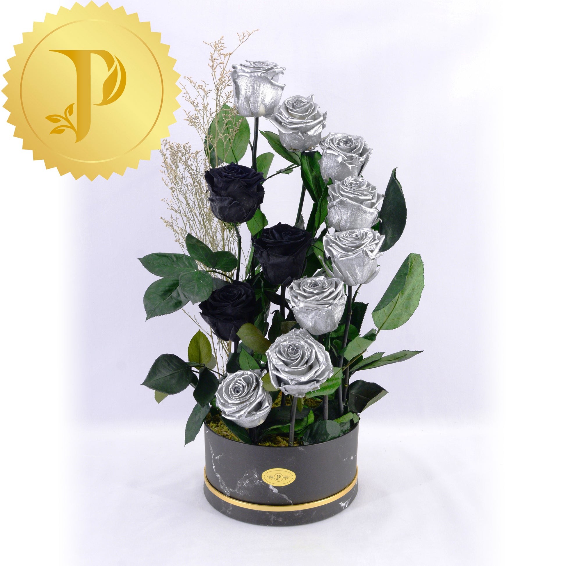 A graceful curl formed by this interstellar colour combination of eight shiny silver and three midnight black coloured roses nesting inside. The elegance of this arrangement is enhanced with our black marble patterned container.