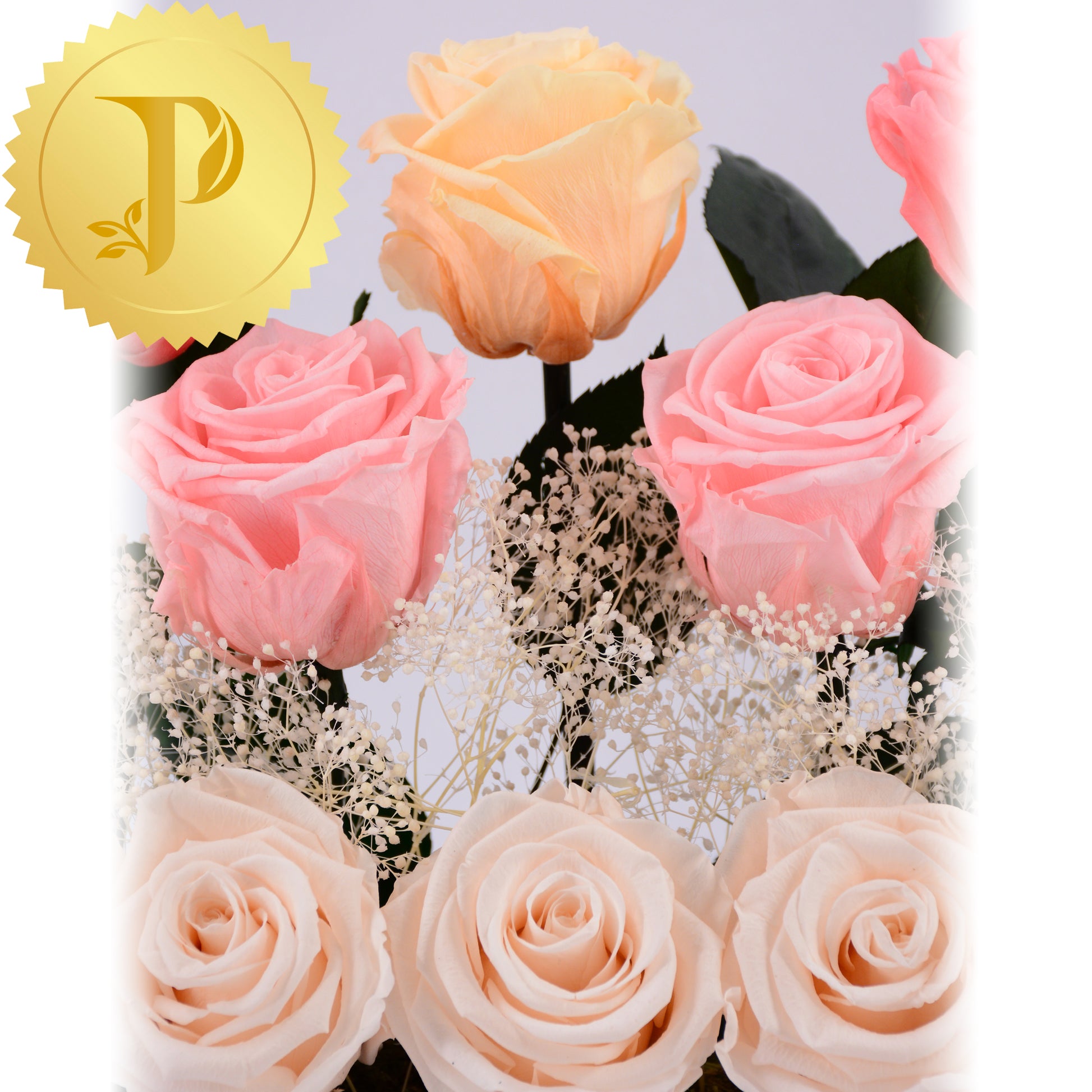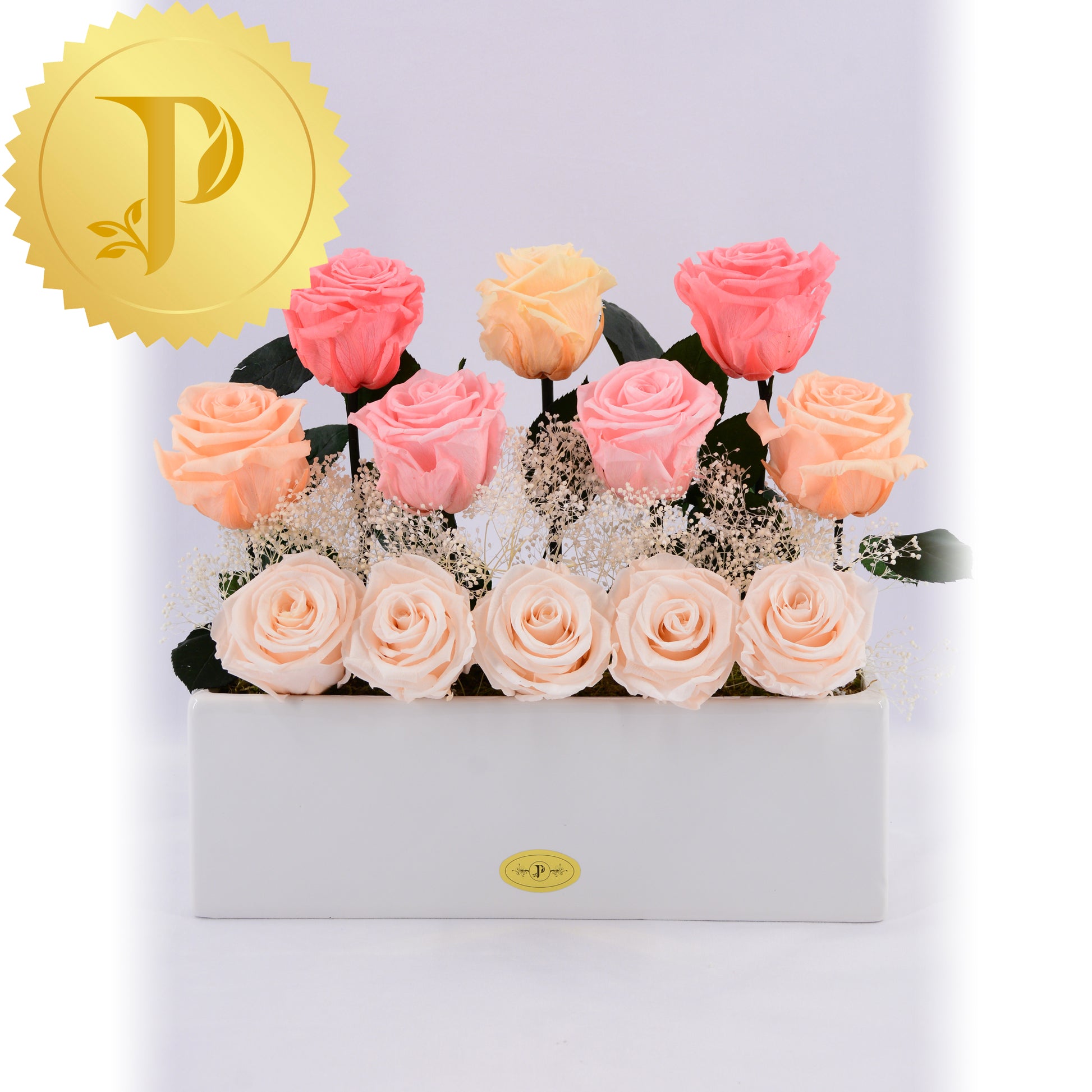 Bring in the charm of the outside in this petite indoor planter with shades of peach roses. This charming arrangement showcases a dozen different roses with lacy white gypsophila. A base row of light peach roses is used to accentuate the other darker peach colours. Our roses are placed in a white ceramic planter adorned with preserved moss used to give a more realistic effect.
