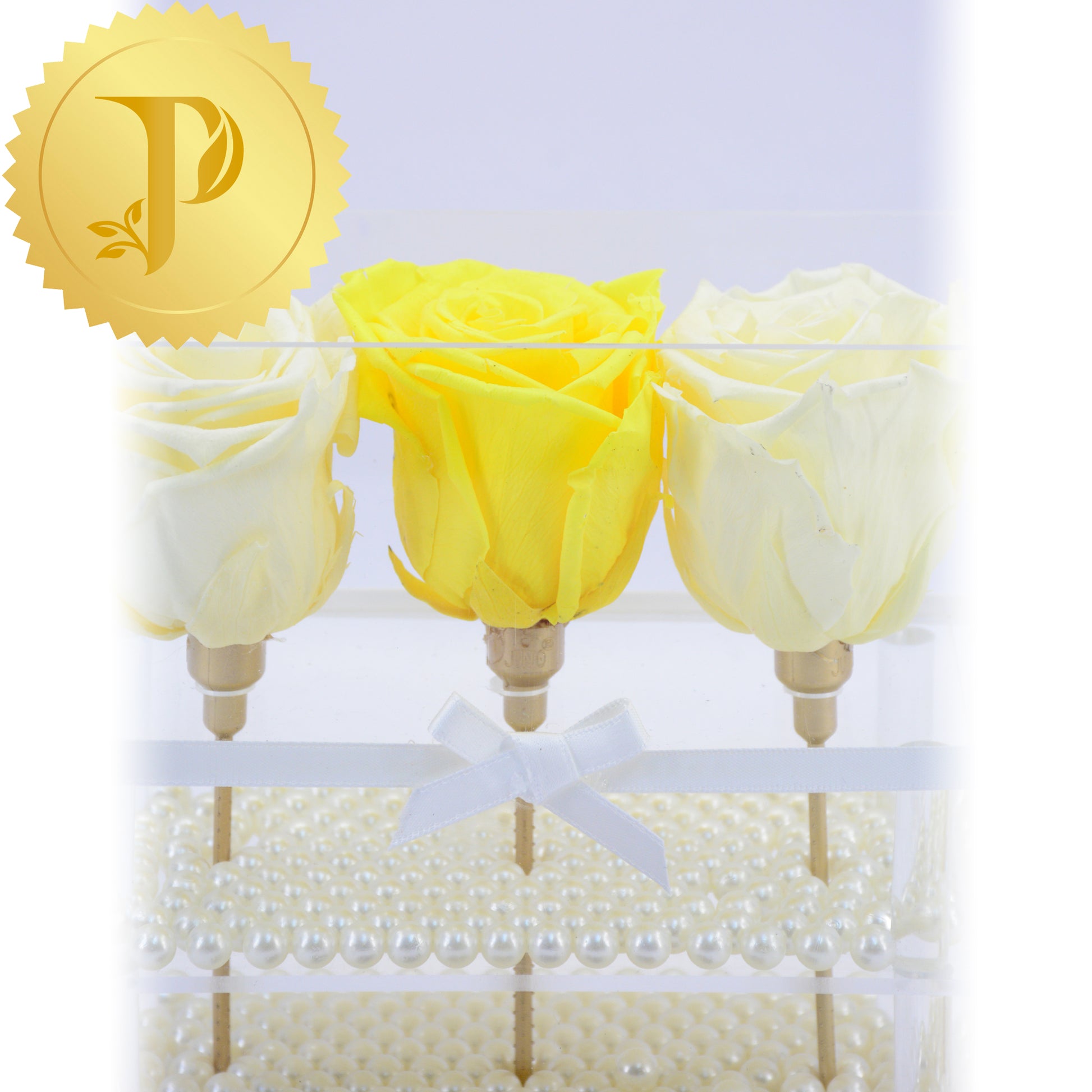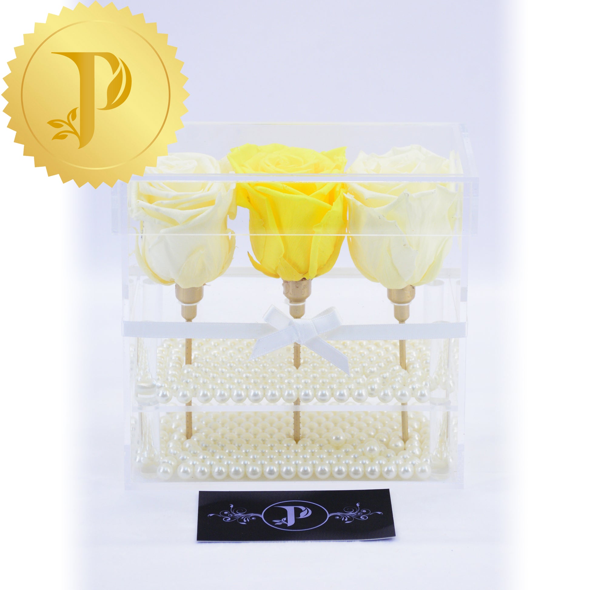 Arrangements in acrylic are available either with a drawer or tall with stems and no drawer. All arrangements come with a layer of your choice of either matching faux pearls, natural stones (lapis lazuli), crystals (clear and rose quartz) or crushed glass (gold). The drawers can be filled with either Ferrero Rocher or Baci chocolates. Acrylic boxes will be highlighted with a white ribbon.