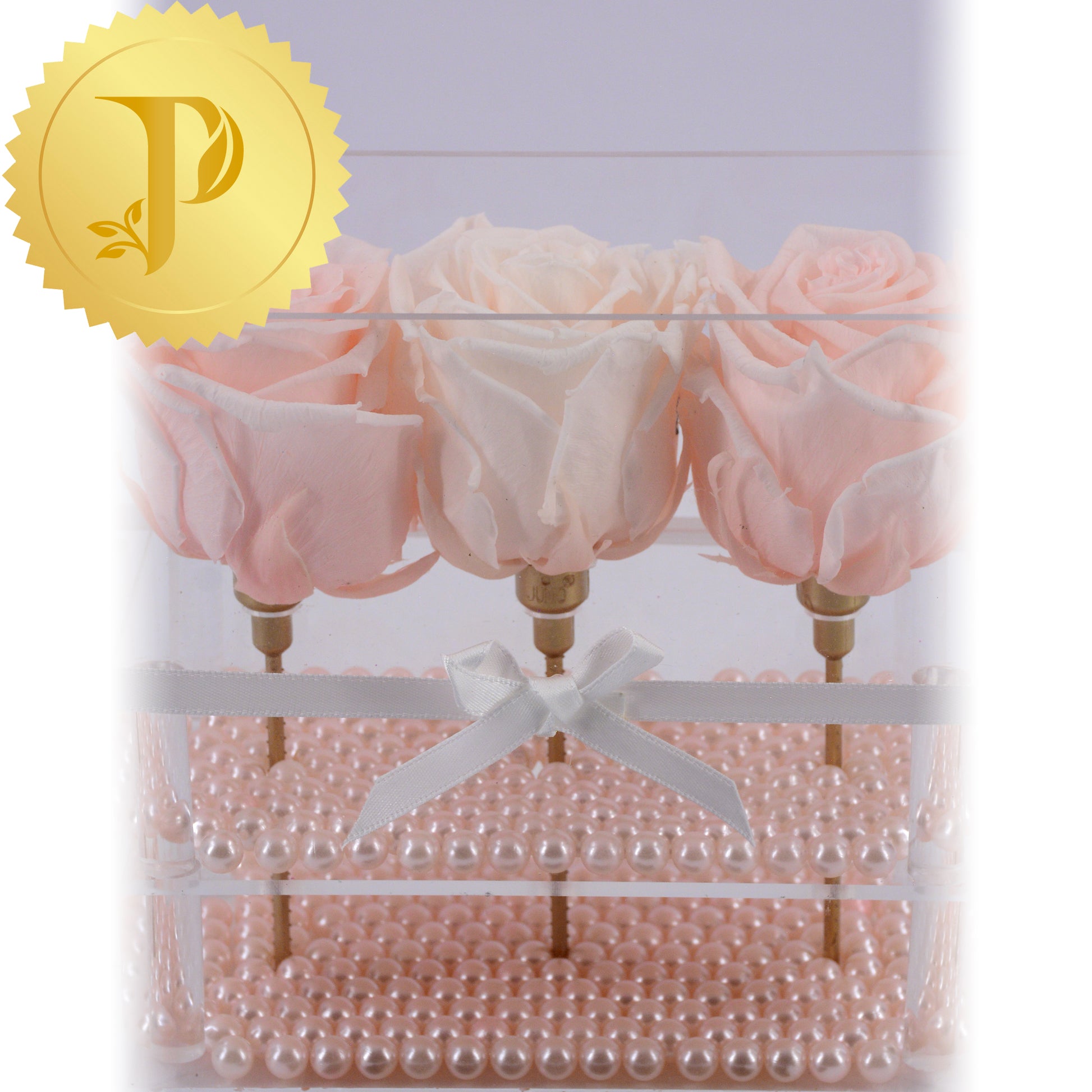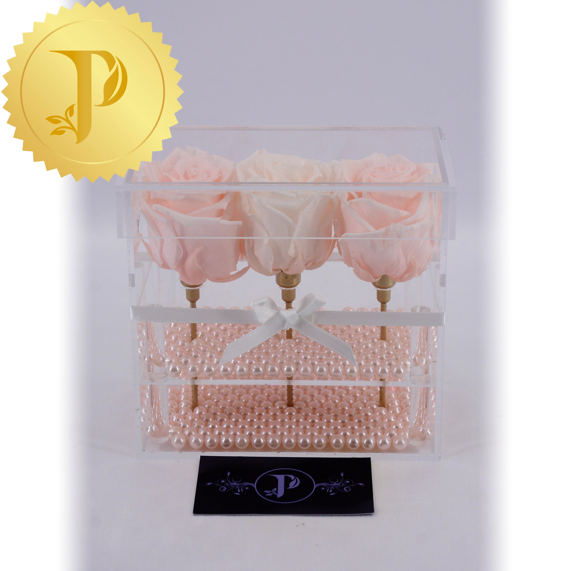 Arrangements in acrylic are available either with a drawer or tall with stems and no drawer. All arrangements come with a layer of your choice of either matching faux pearls, natural stones (lapis lazuli), crystals (clear and rose quartz) or crushed glass (gold). The drawers can be filled with either Ferrero Rocher or Baci chocolates. Acrylic boxes will be highlighted with a white ribbon.