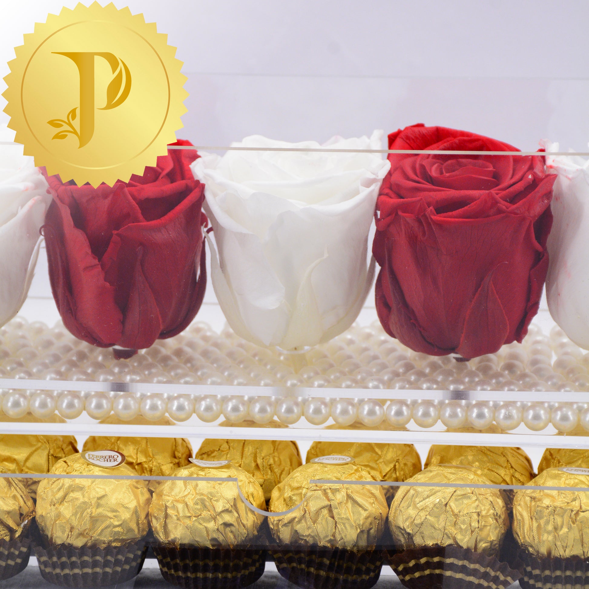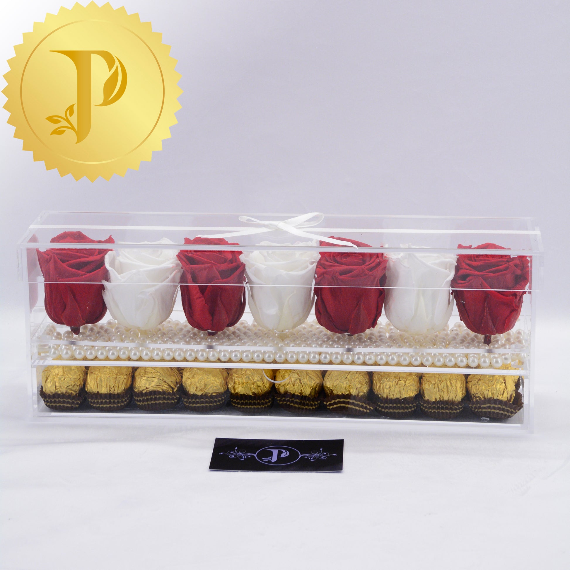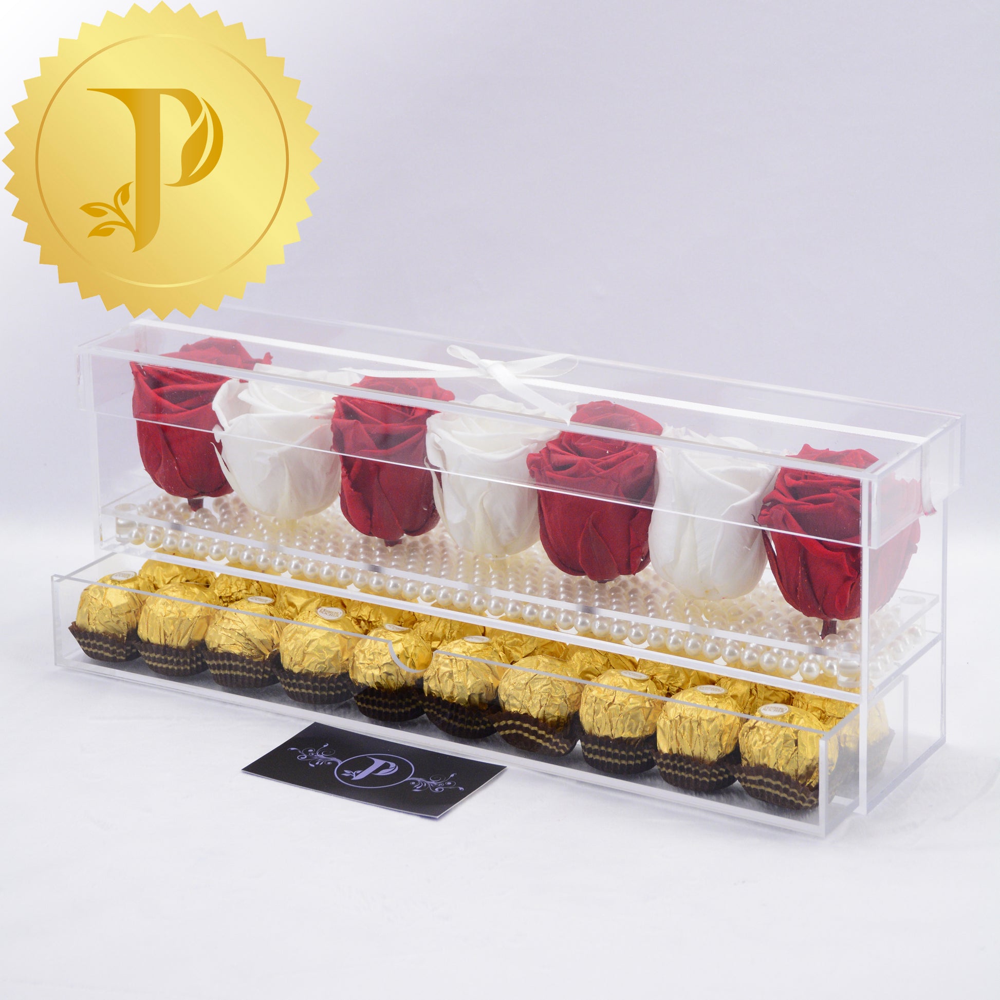 Honour your sweet tooth and Canada with these seven red and white candy cane coloured roses in a clear acrylic box. This gift set is complemented with a layer of faux white pearls and a drawer filled with Ferrero Rocher chocolates.