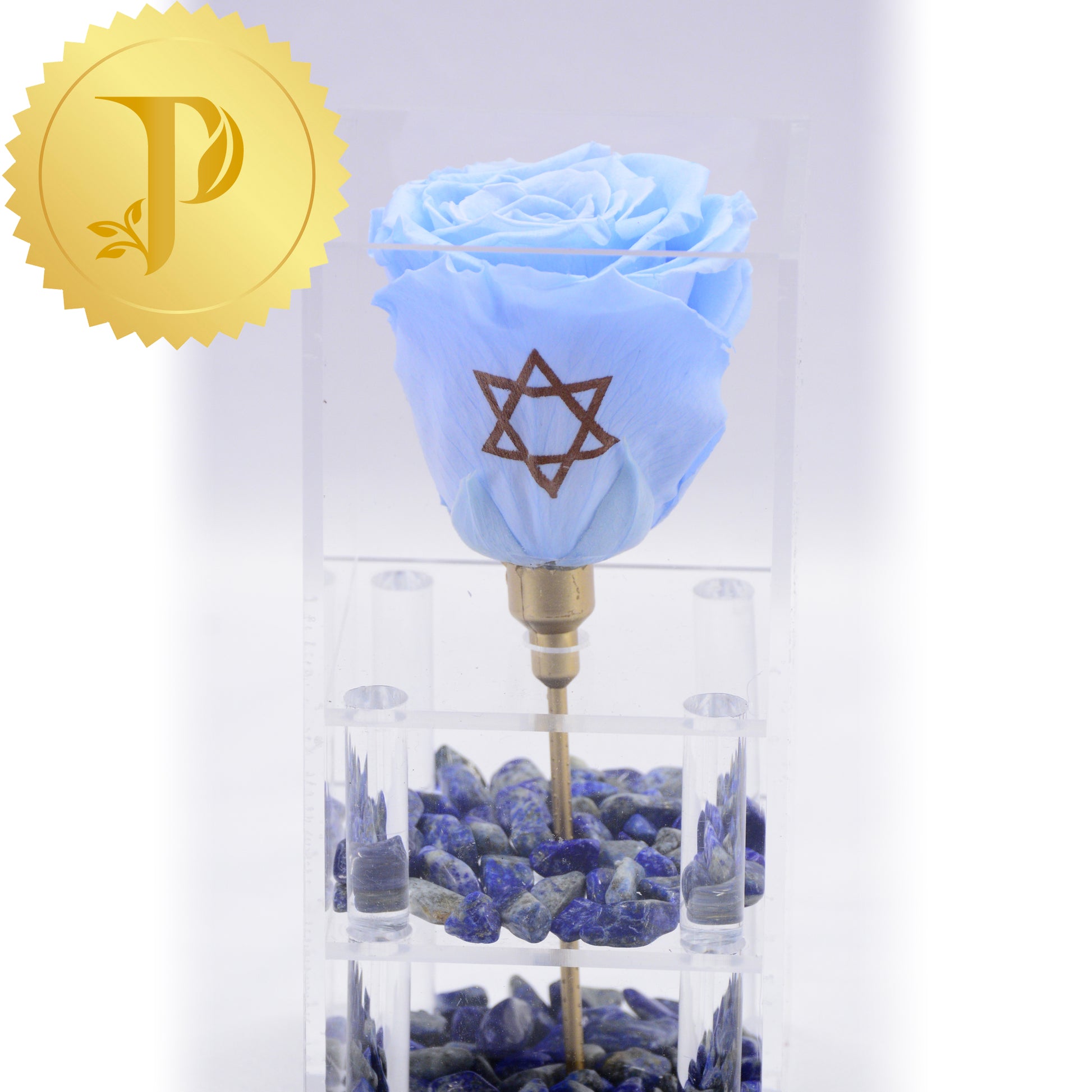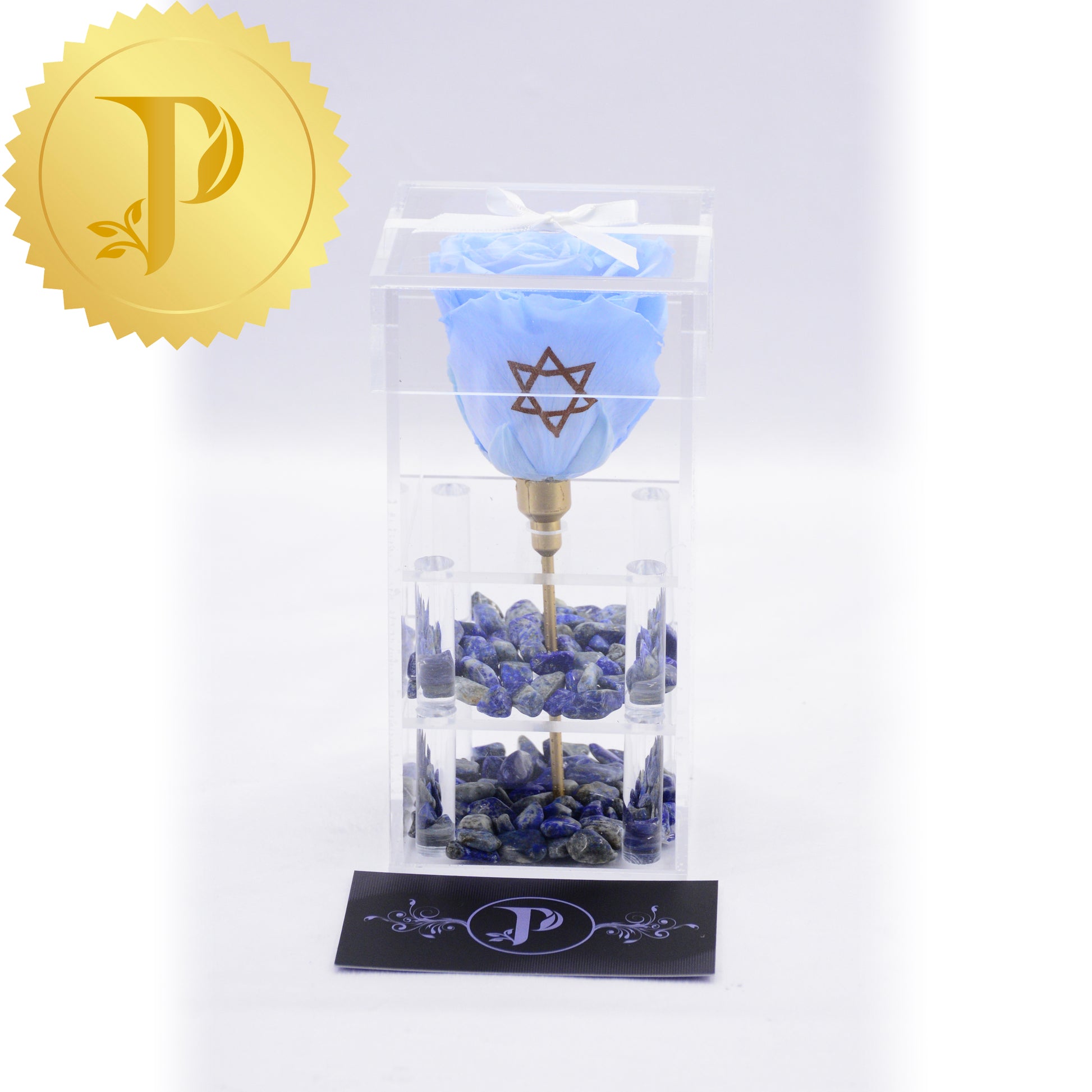 The Star of David print celebrates Judaism and can be enjoyed all year. This light blue rose is placed on a faux gold stem complemented by two layers of the stone lapis lazuli, known for it’s soothing and comforting properties.