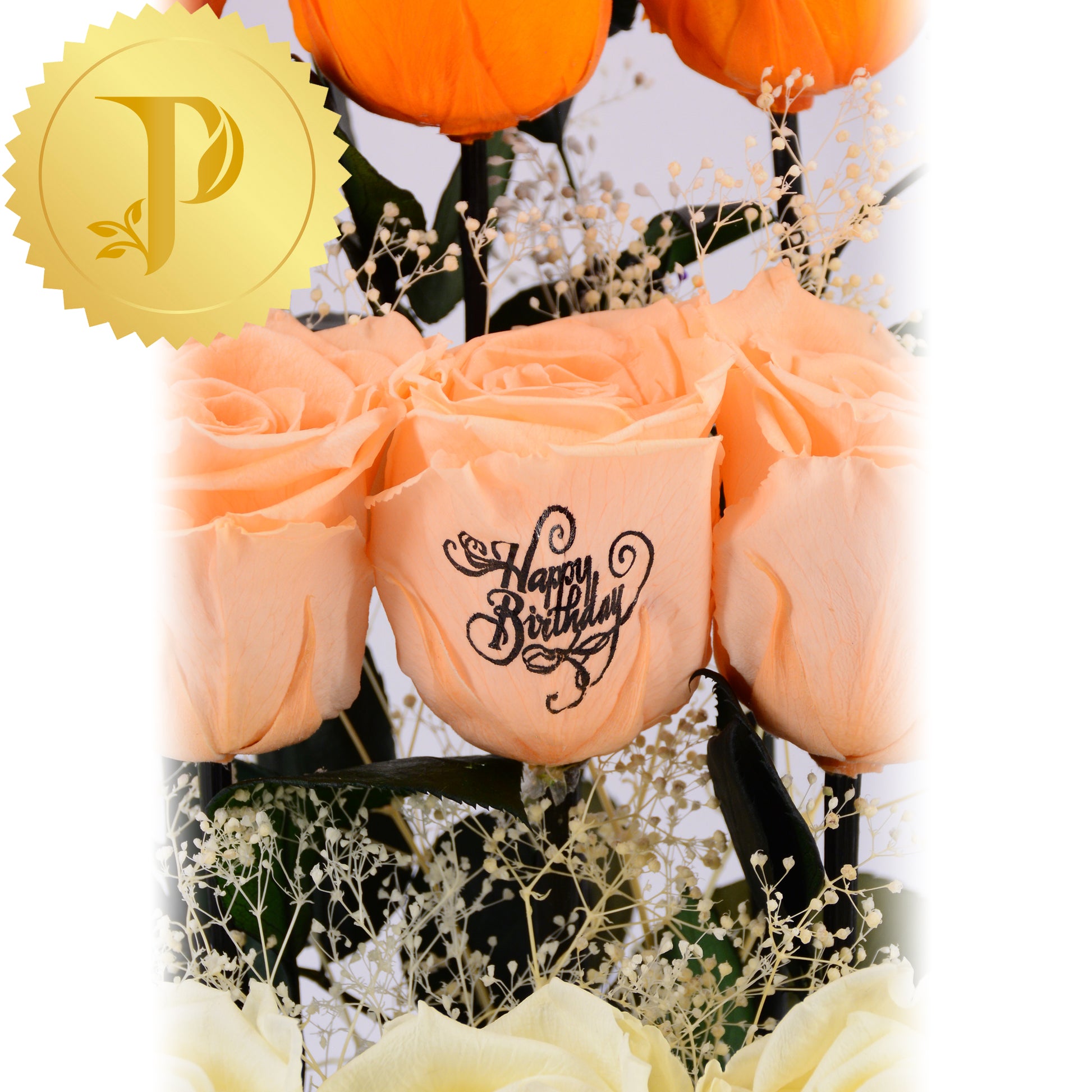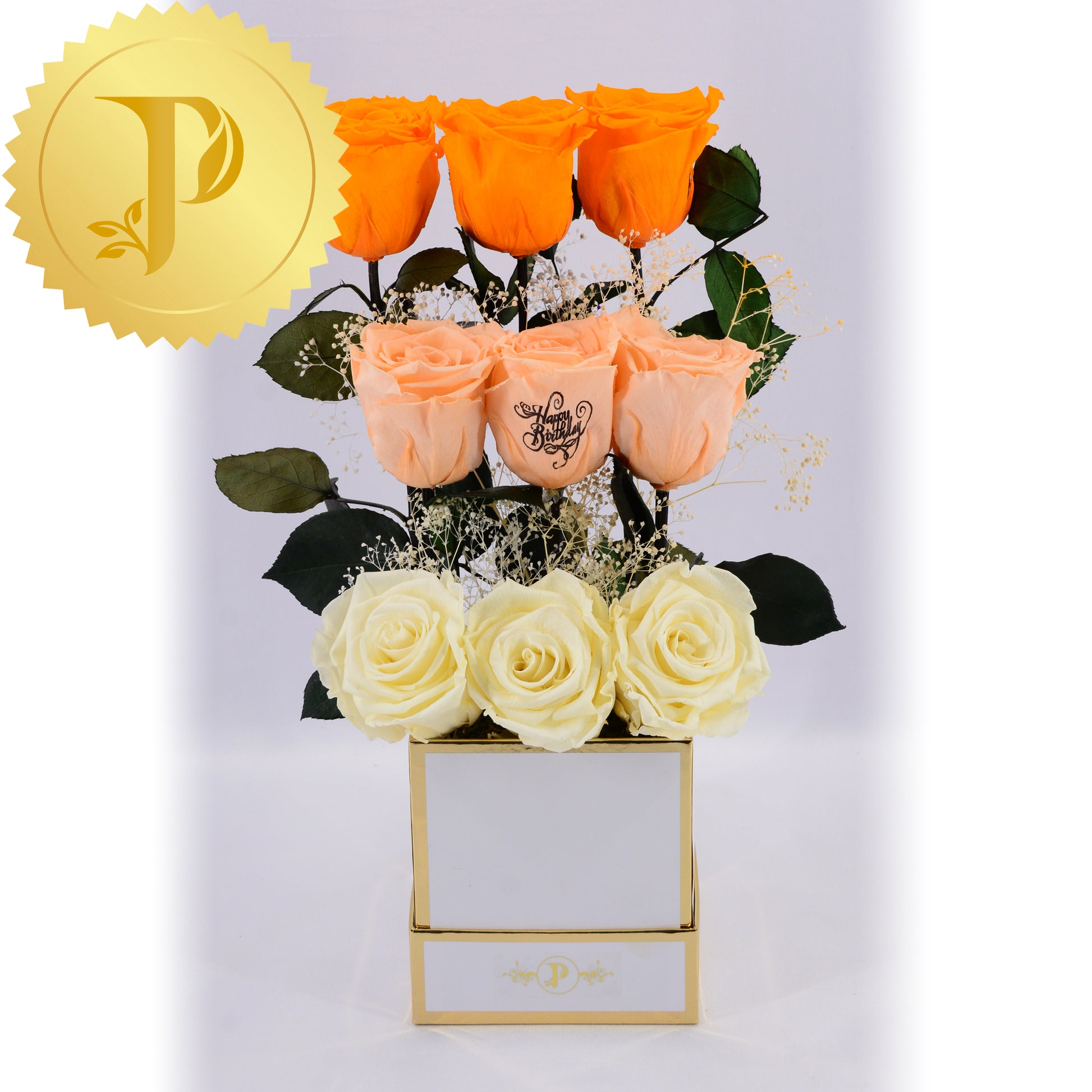 Bring in the glow of the sunset with this trio of nine beautiful, tiered roses in a concert of colour. This delightful arrangement is placed in a square white gold trimmed box, adorned with preserved moss to give a more realistic effect.