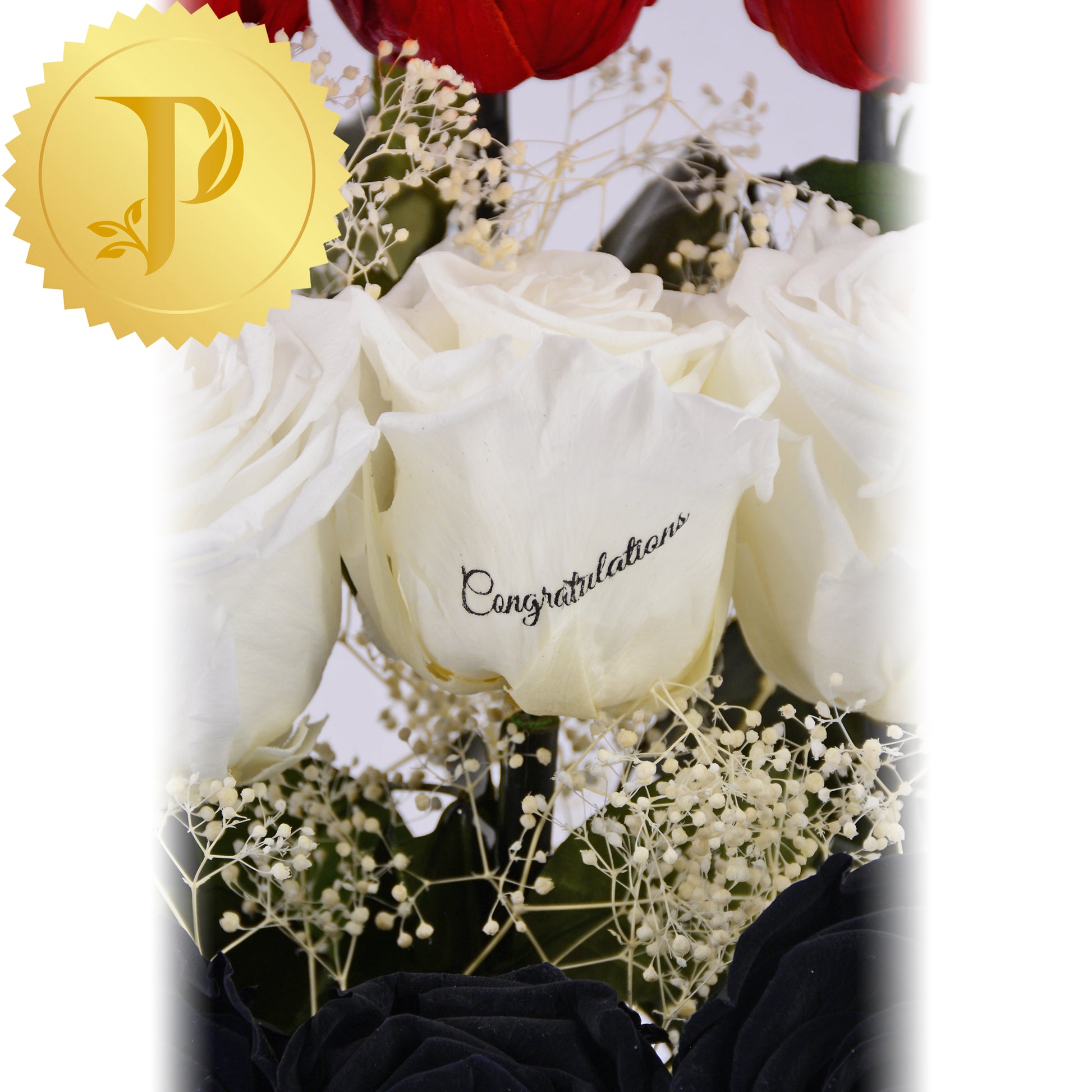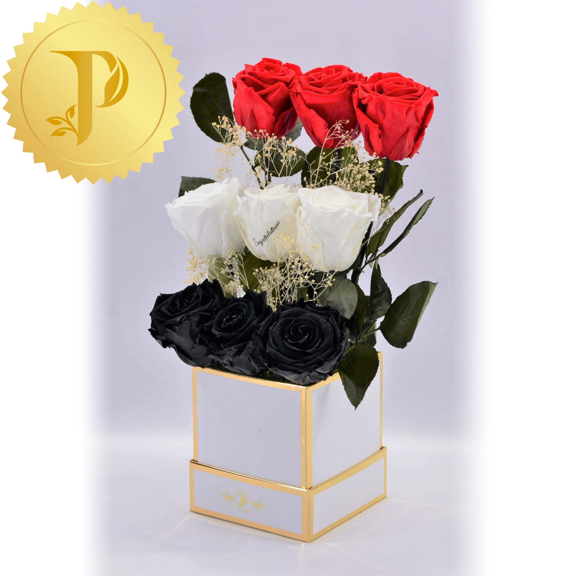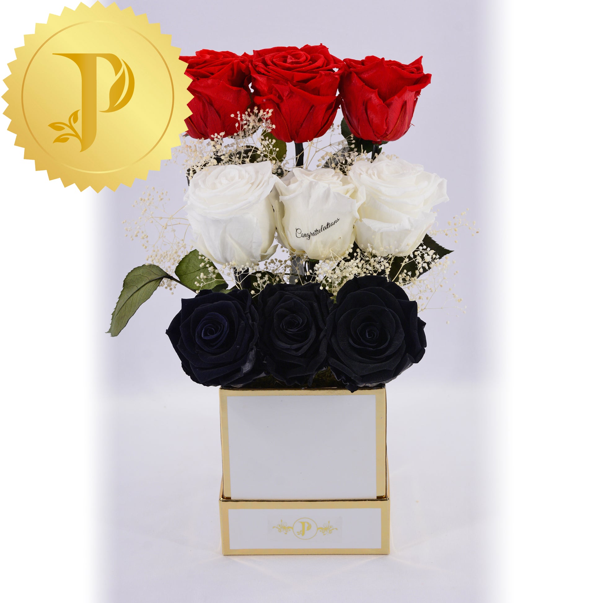Celebrate the spirit of Canada by teaming up red, white and black, in these nine beautiful, tiered roses giving a concert of colour. This delightful arrangement is placed in a square white gold trimmed box, adorned with preserved moss to give a more realistic effect.