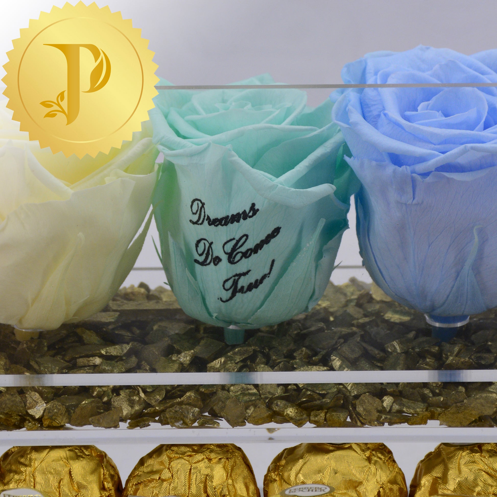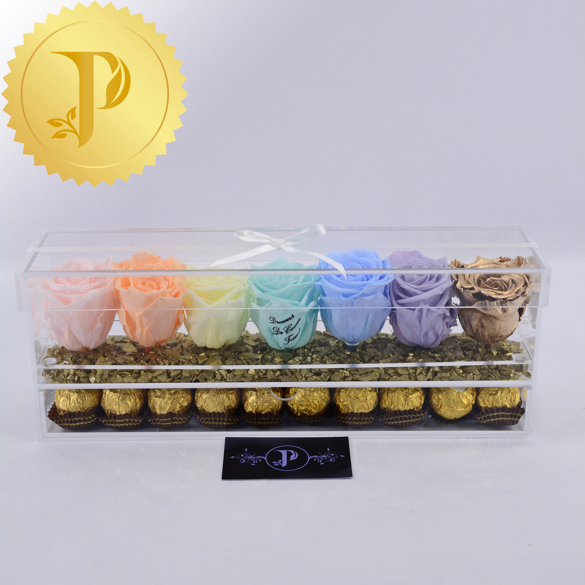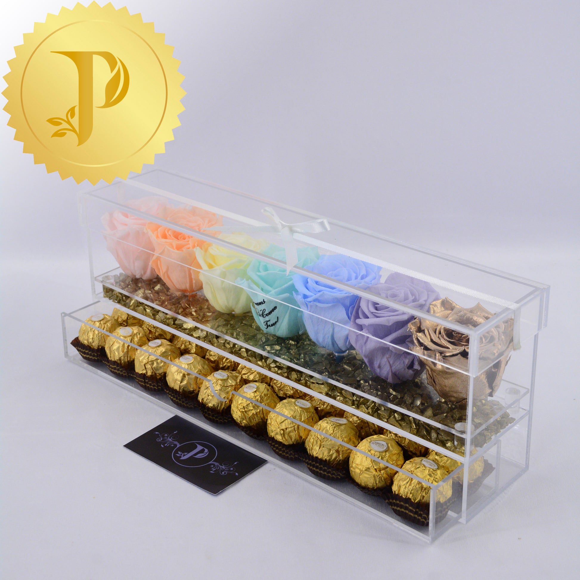 Arrangements in acrylic are available either with a drawer or tall with stems and no drawer. All arrangements come with a layer of your choice of either matching faux pearls, natural stones (lapis lazuli), crystals (clear and rose quartz) or crushed glass (gold). The drawers can be filled with either Ferrero Rocher or Baci chocolates. Acrylic boxes will be highlighted with a white ribbon.