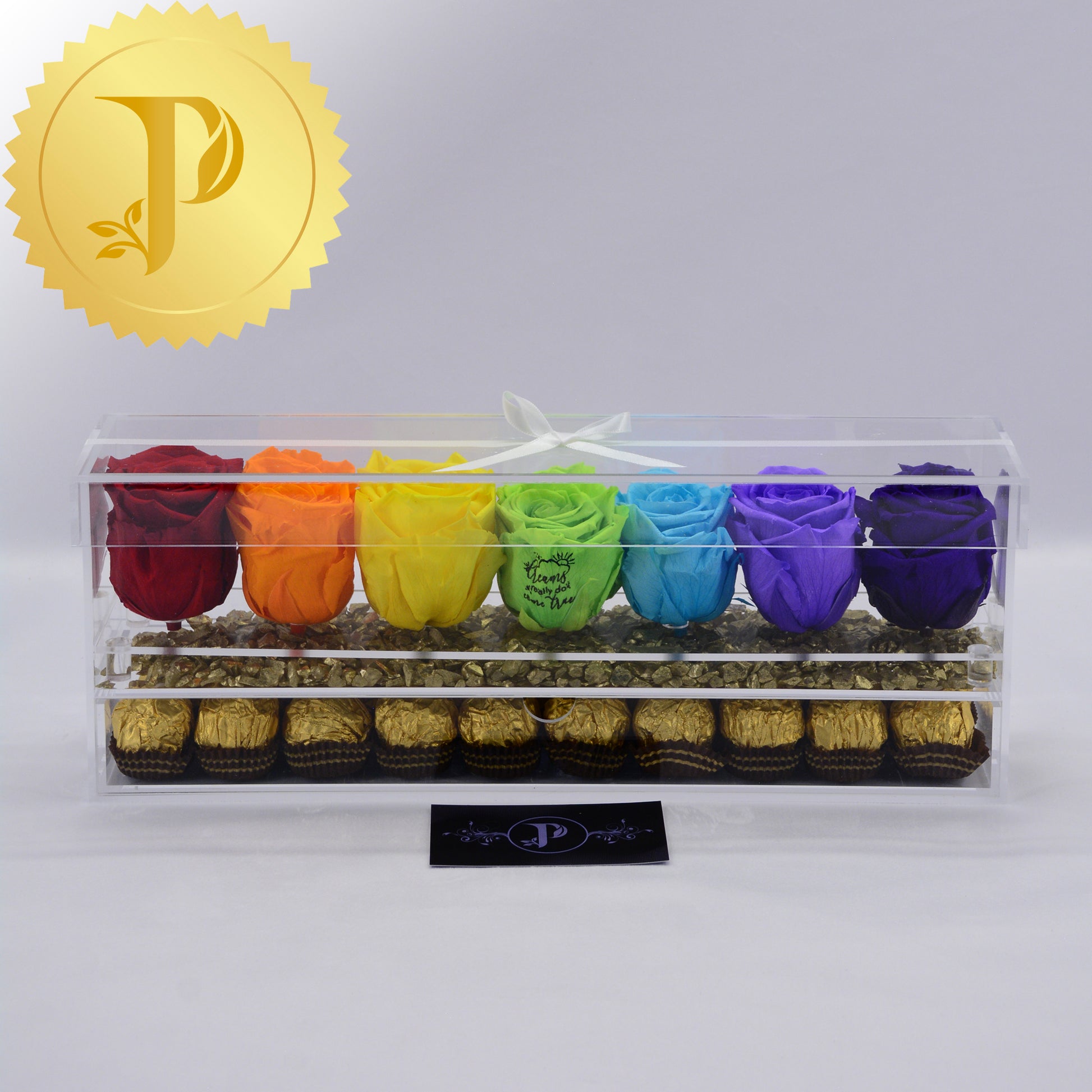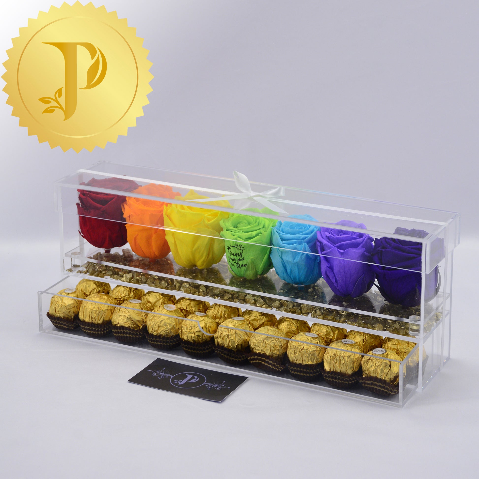 Arrangements in acrylic are available either with a drawer or tall with stems and no drawer. All arrangements come with a layer of your choice of either matching faux pearls, natural stones (lapis lazuli), crystals (clear and rose quartz) or crushed glass (gold). The drawers can be filled with either Ferrero Rocher or Baci chocolates. Acrylic boxes will be highlighted with a white ribbon.