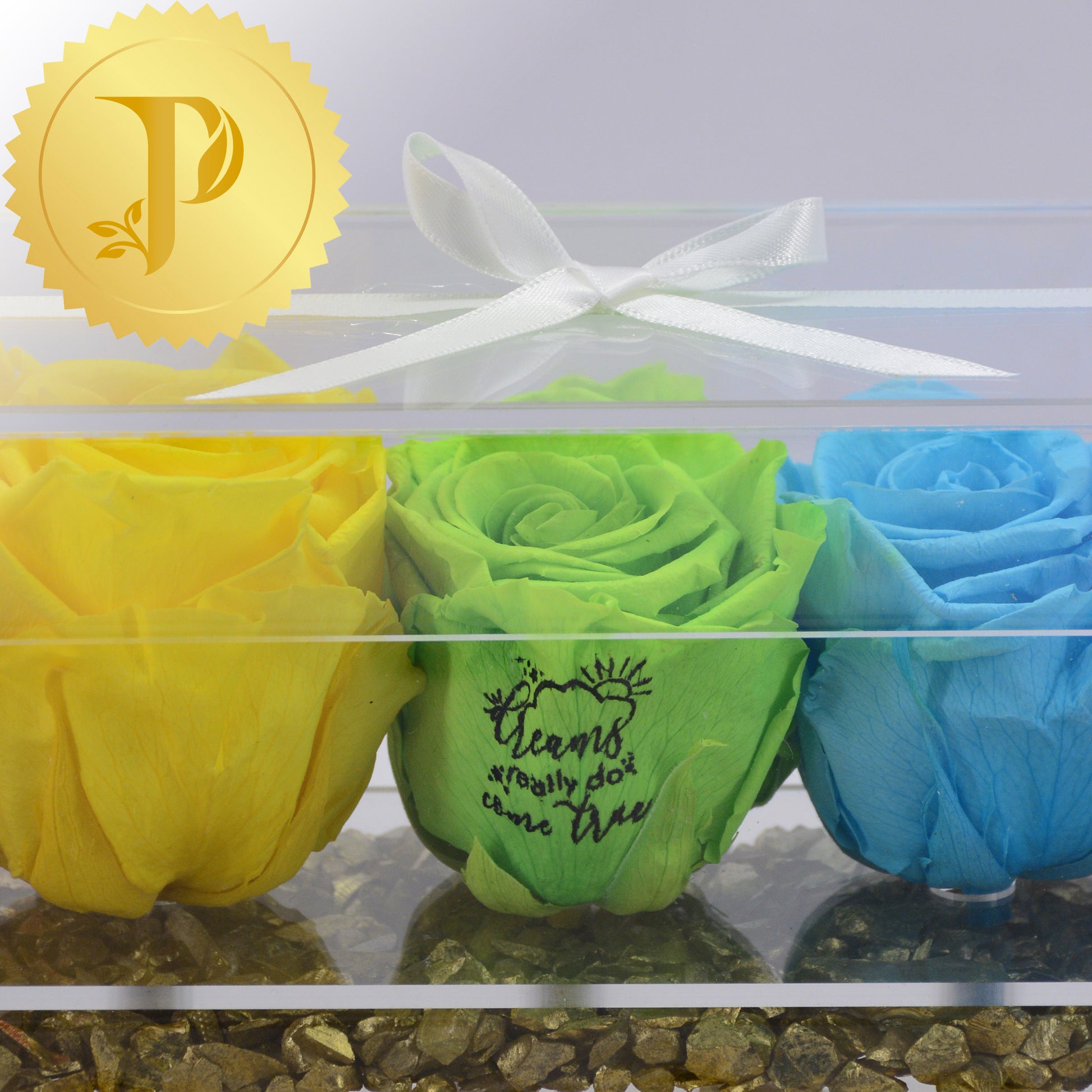 This seven rose acrylic set are complemented by golden crushed glass to represent the gold at the end of the rainbow.