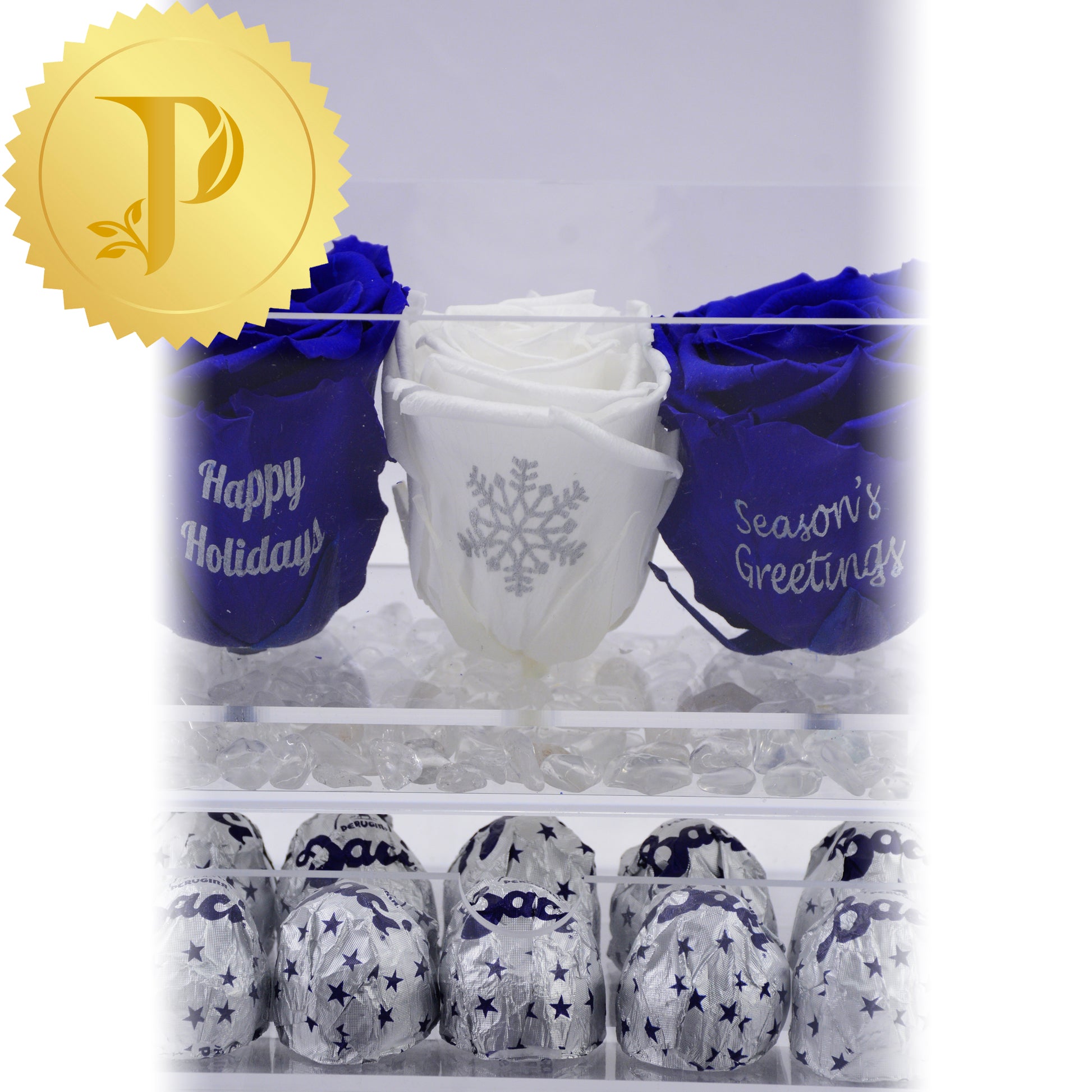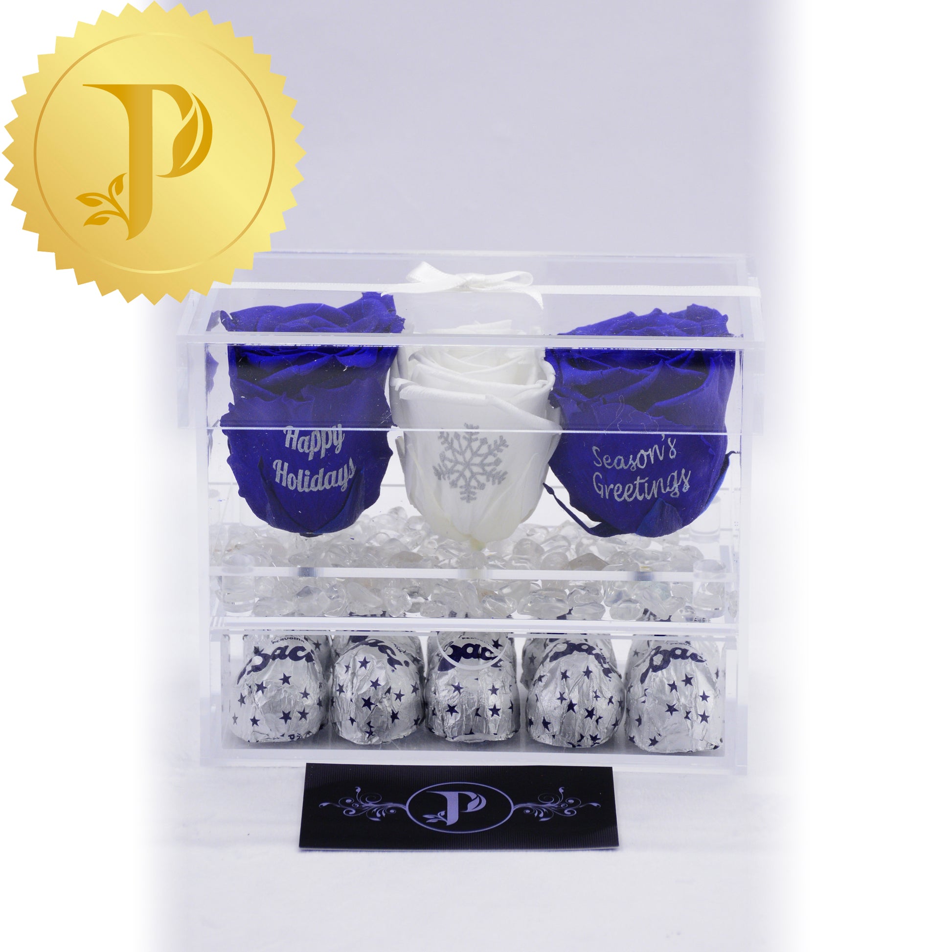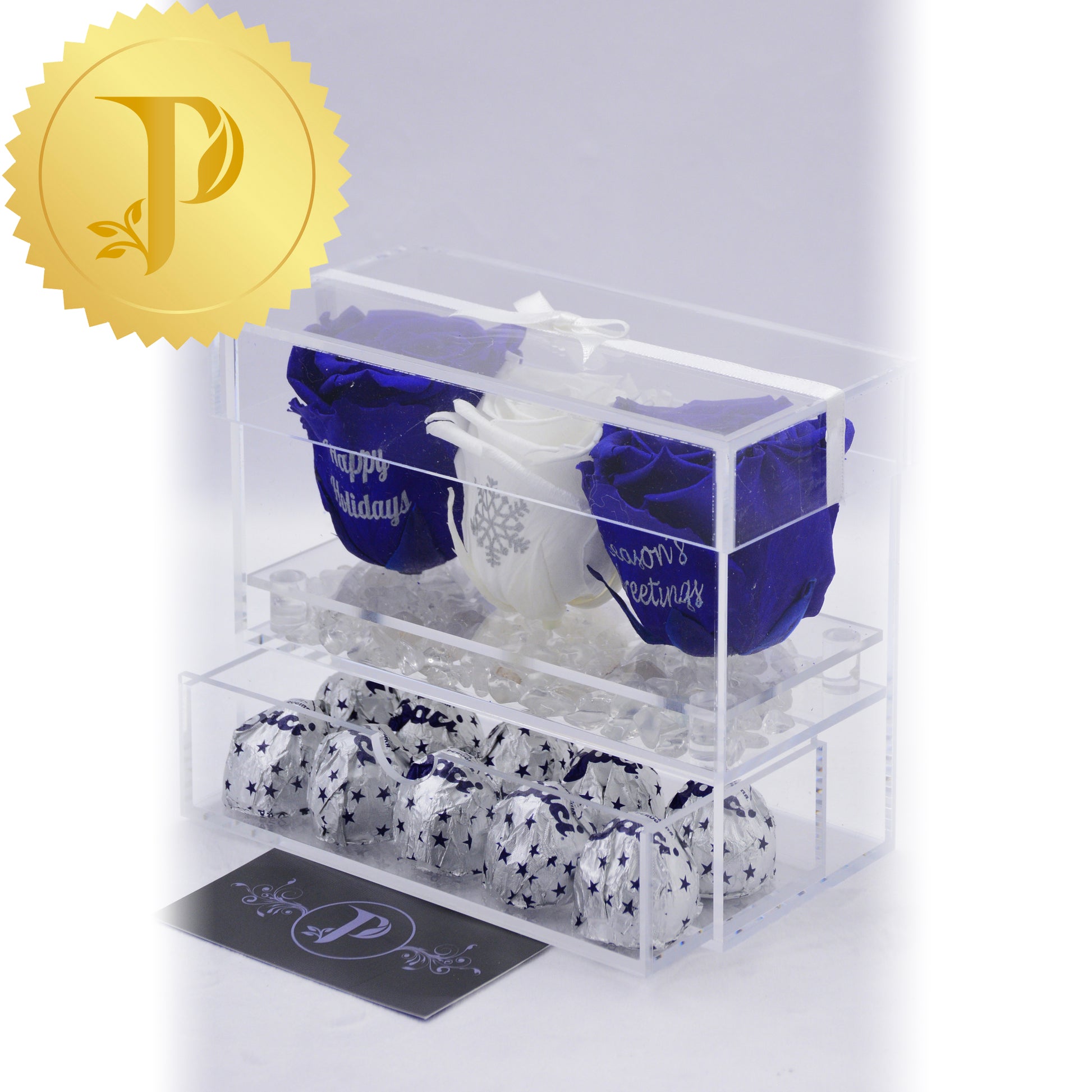 This rose trio in acrylic with royal blue and white-coloured roses are complemented by a layer of clear quartz and a drawer filled with Ferrero Rocher chocolates. Clear quartz is a crystal known for energizing one’s mental clarity and healing properties.