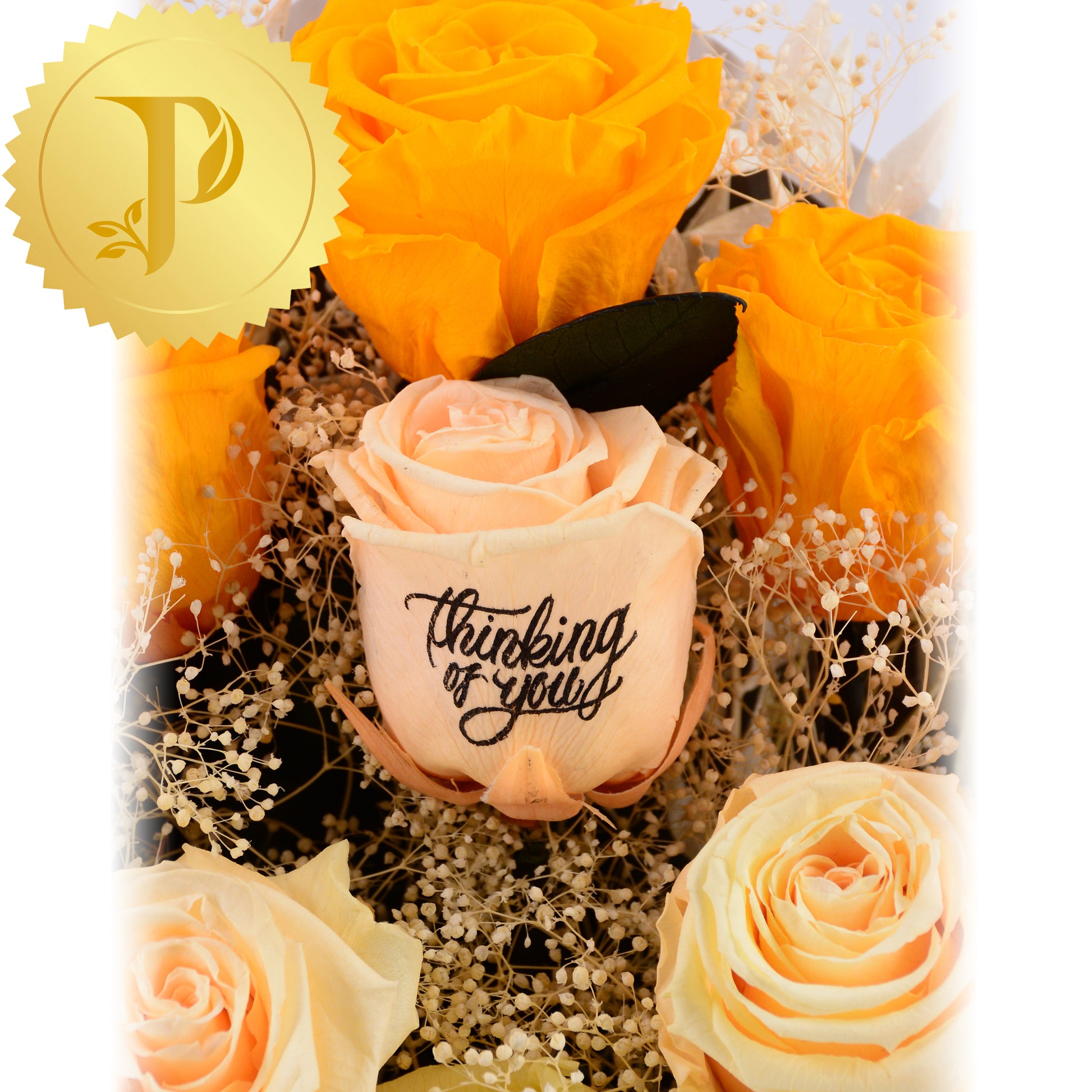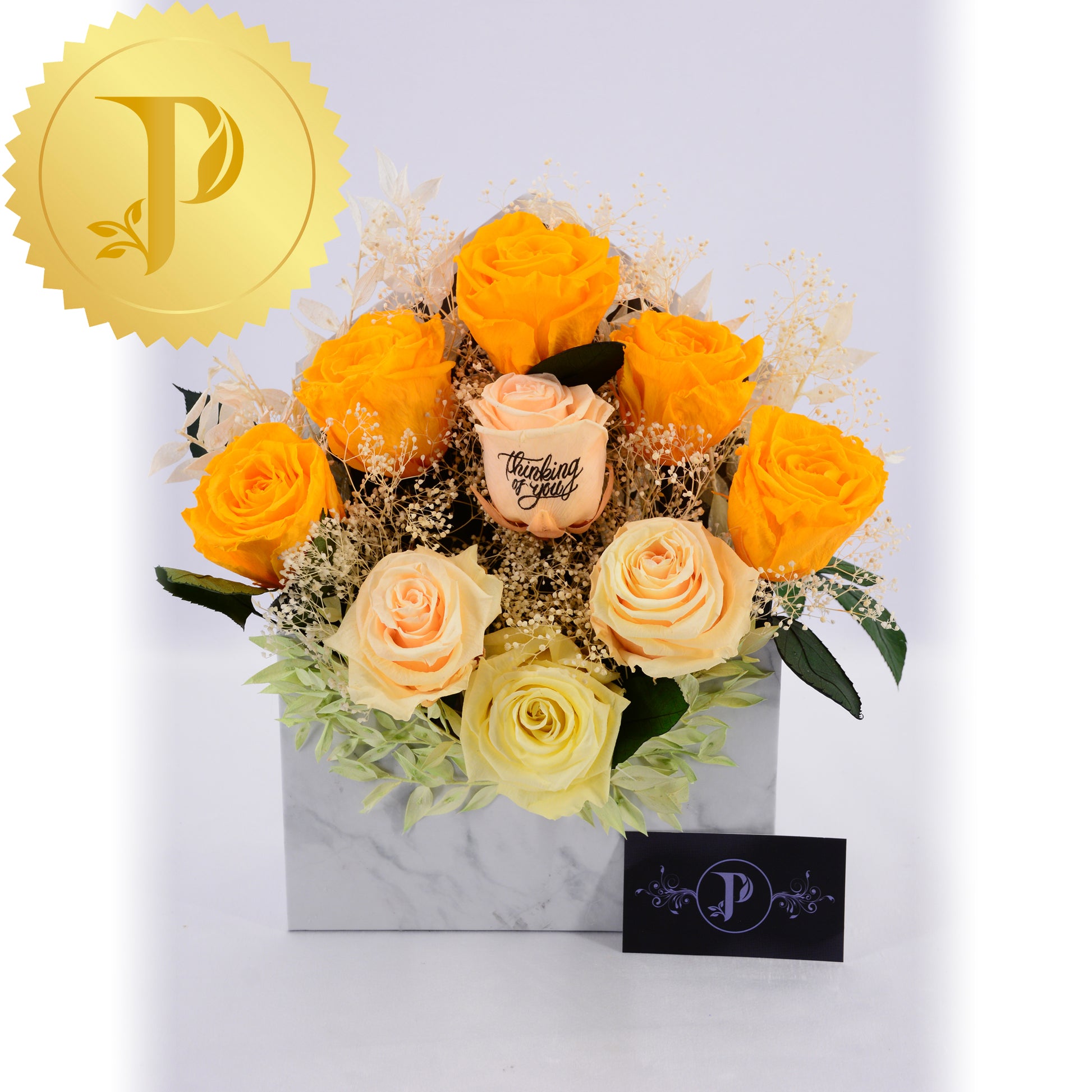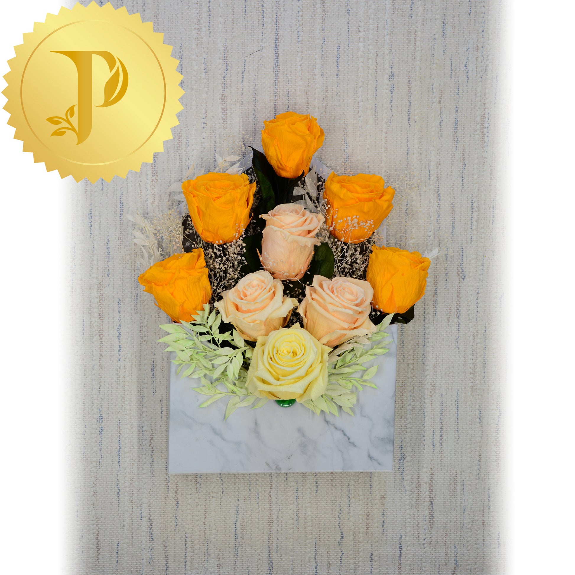 Convey a sweet message of love and friendship with this cute, marbleized envelope design. A combination of nine roses in orange, peach and yellow, will brighten any room. This delightful arrangement is also suitable for hanging (picture hanger included).