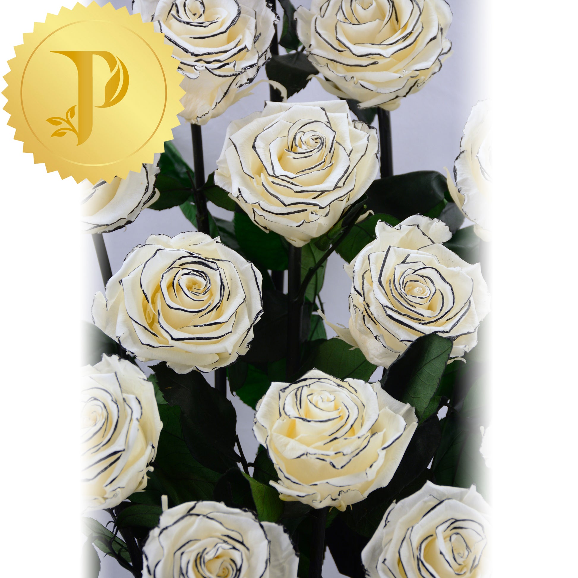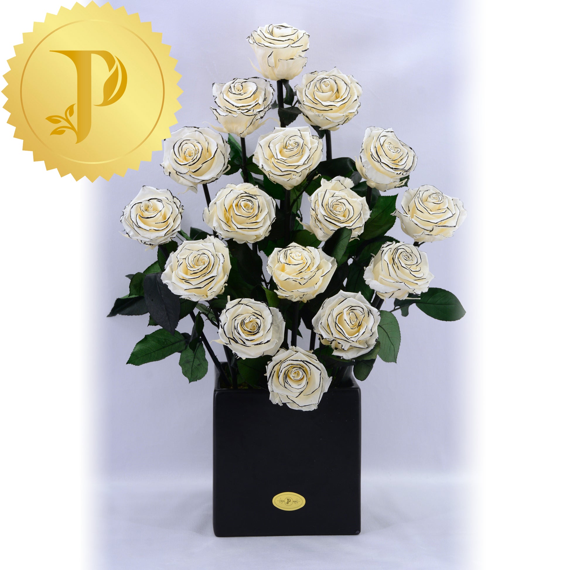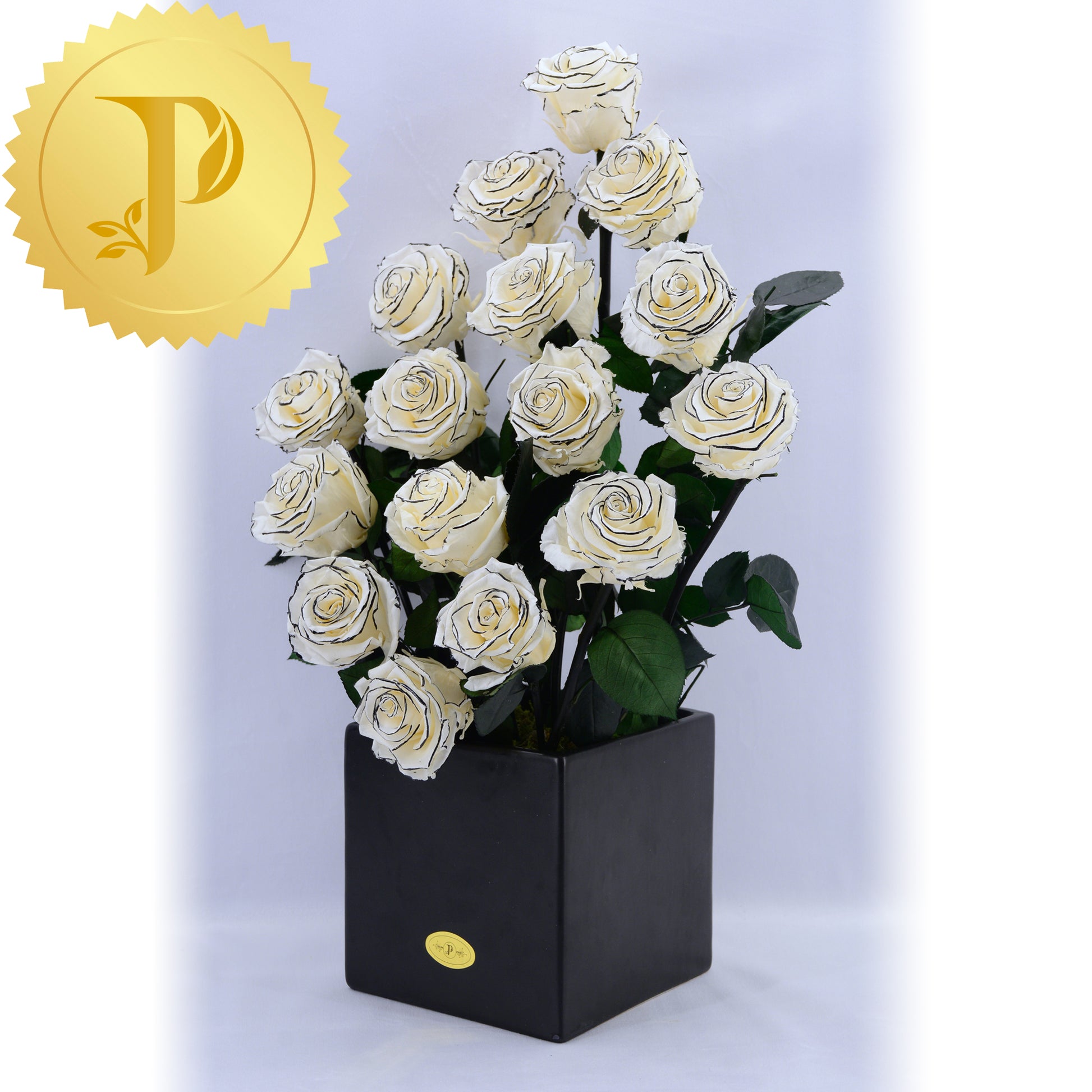 Sixteen tuxedo like roses are positioned to give you a geometric diamond shape. This stylish arrangement is placed in a small six-inch square black ceramic vase, adorned with preserved moss to give a more natural effect.