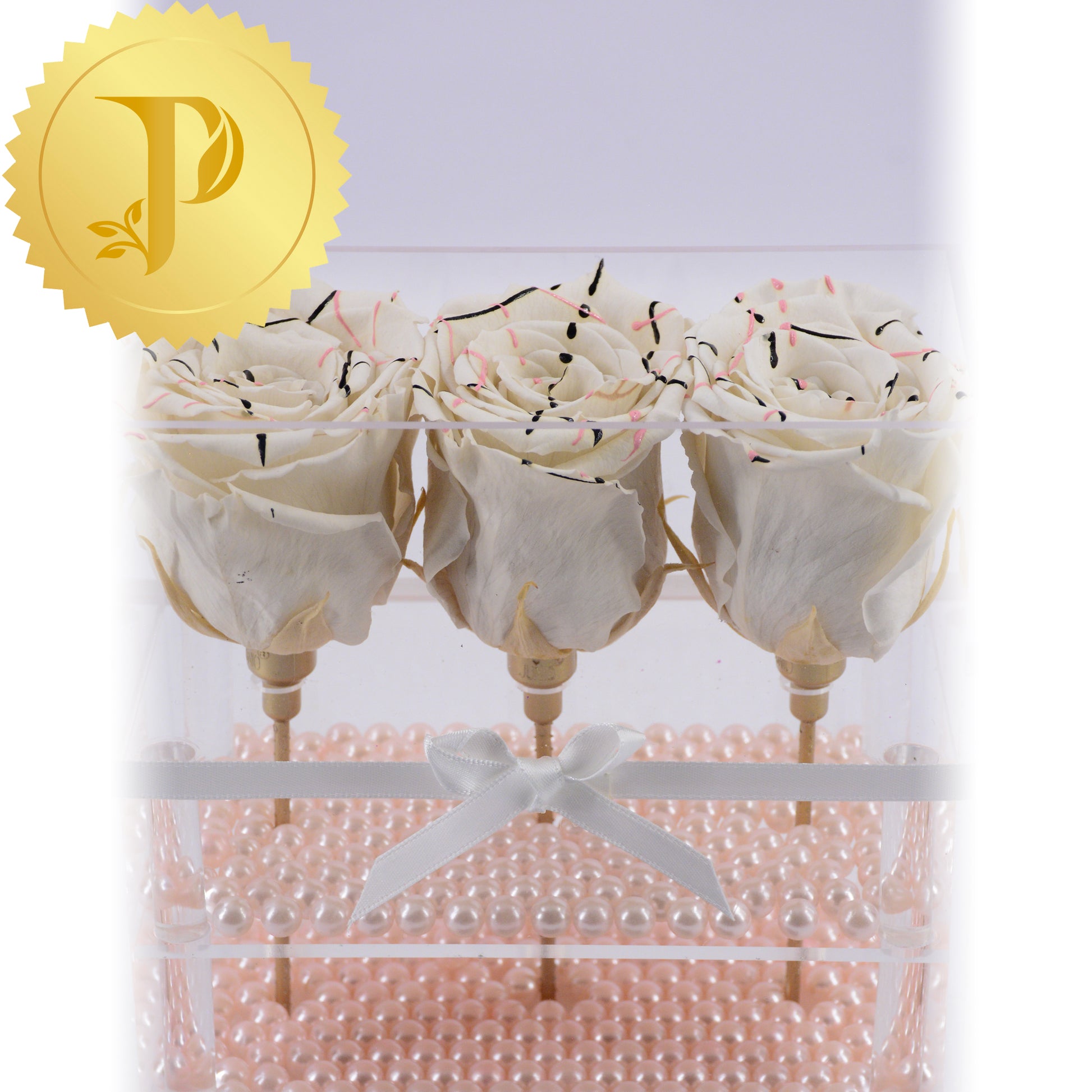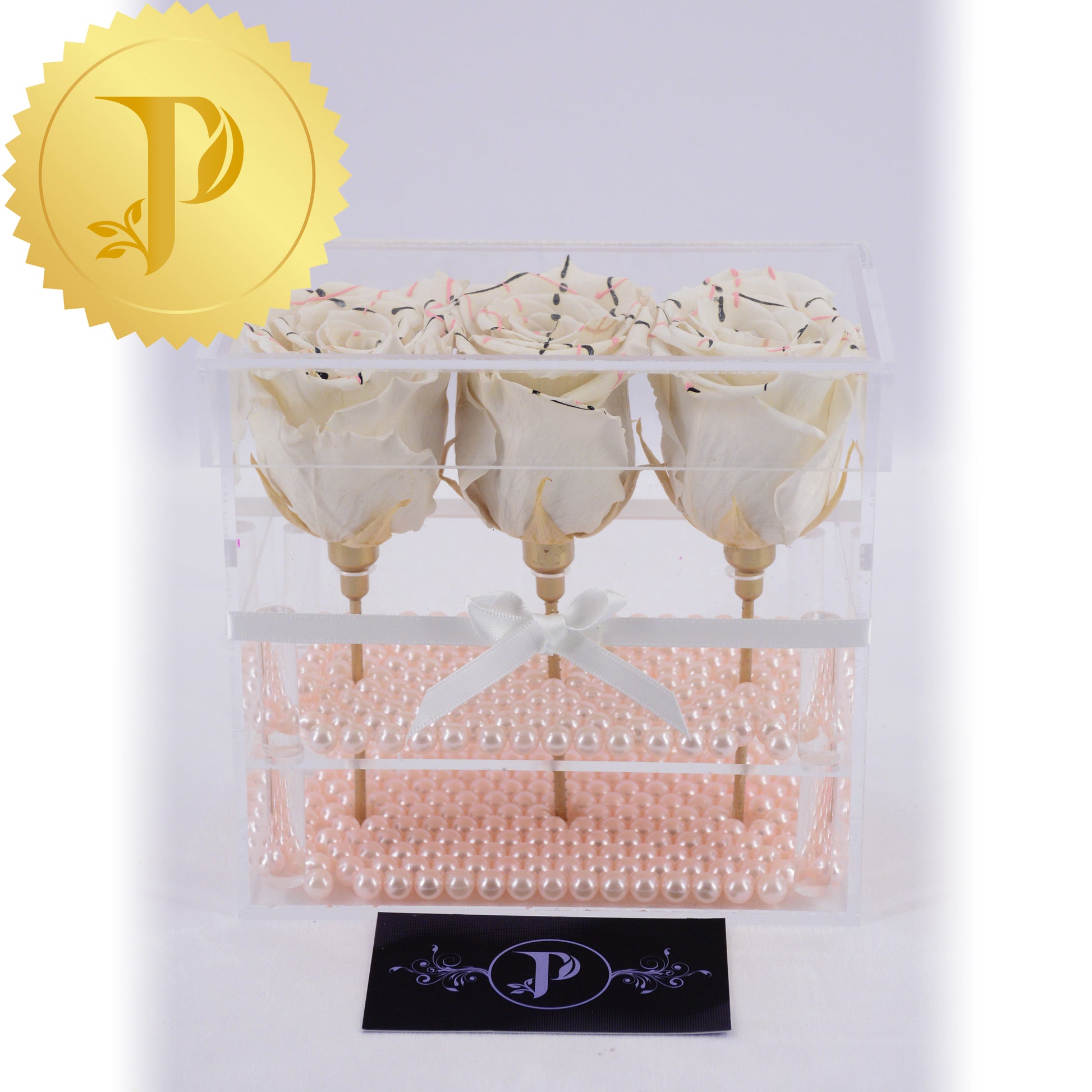 Arrangements in acrylic are available either with a drawer or tall with stems and no drawer. All arrangements come with a layer of your choice of either matching faux pearls, natural stones (lapis lazuli), crystals (clear and rose quartz) or crushed glass (gold). The drawers can be filled with either Ferrero Rocher or Baci chocolates. Acrylic boxes will be highlighted with a white ribbon.