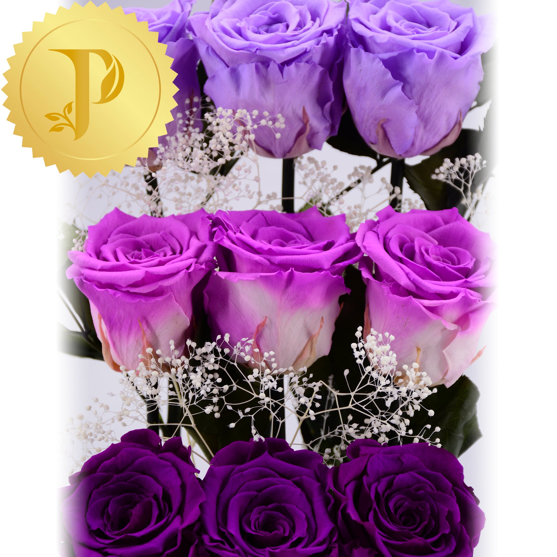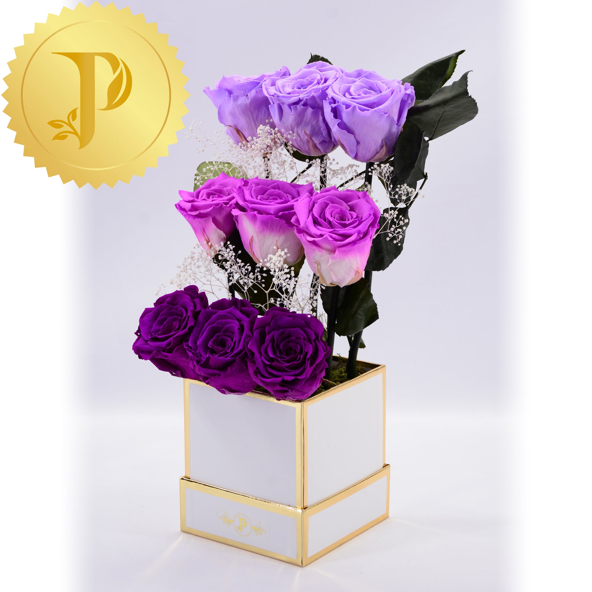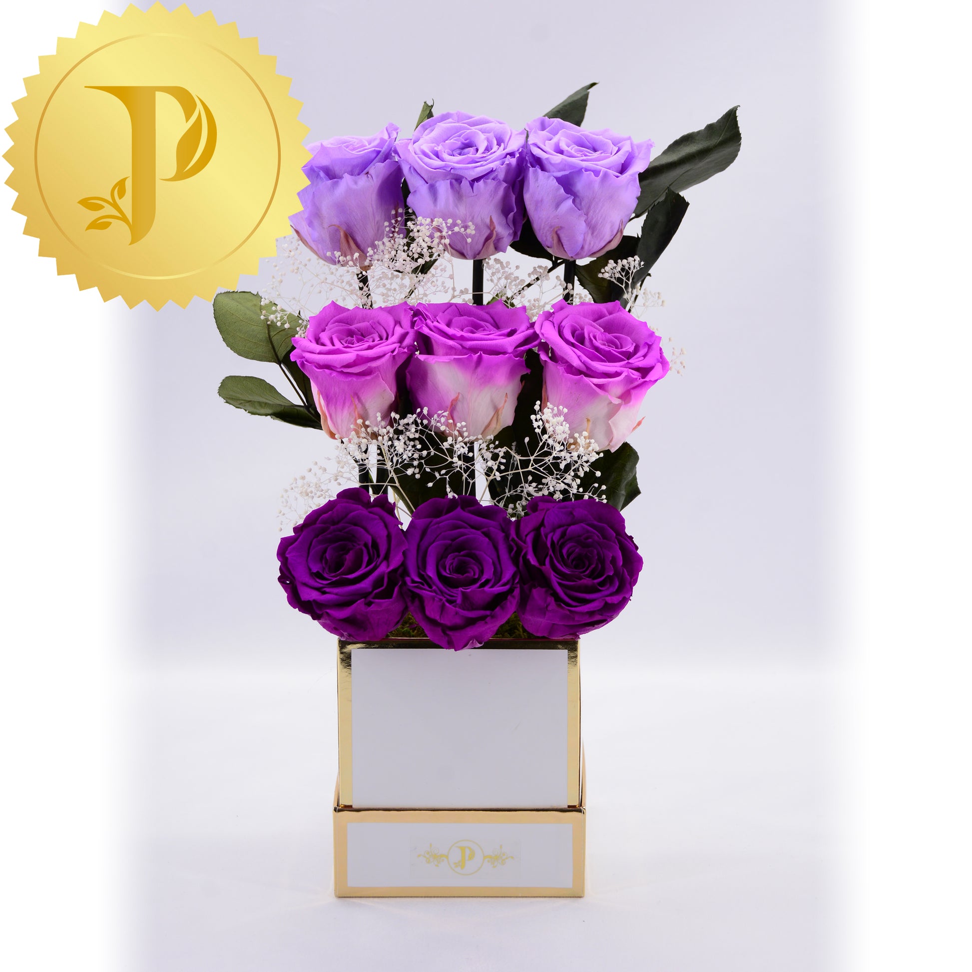 Splashes of purple, paint these nine beautiful, tiered roses sitting on three steps composing a concert of colour. This delightful arrangement is placed in a square white gold trimmed box, adorned with preserved moss to give a more realistic effect.
