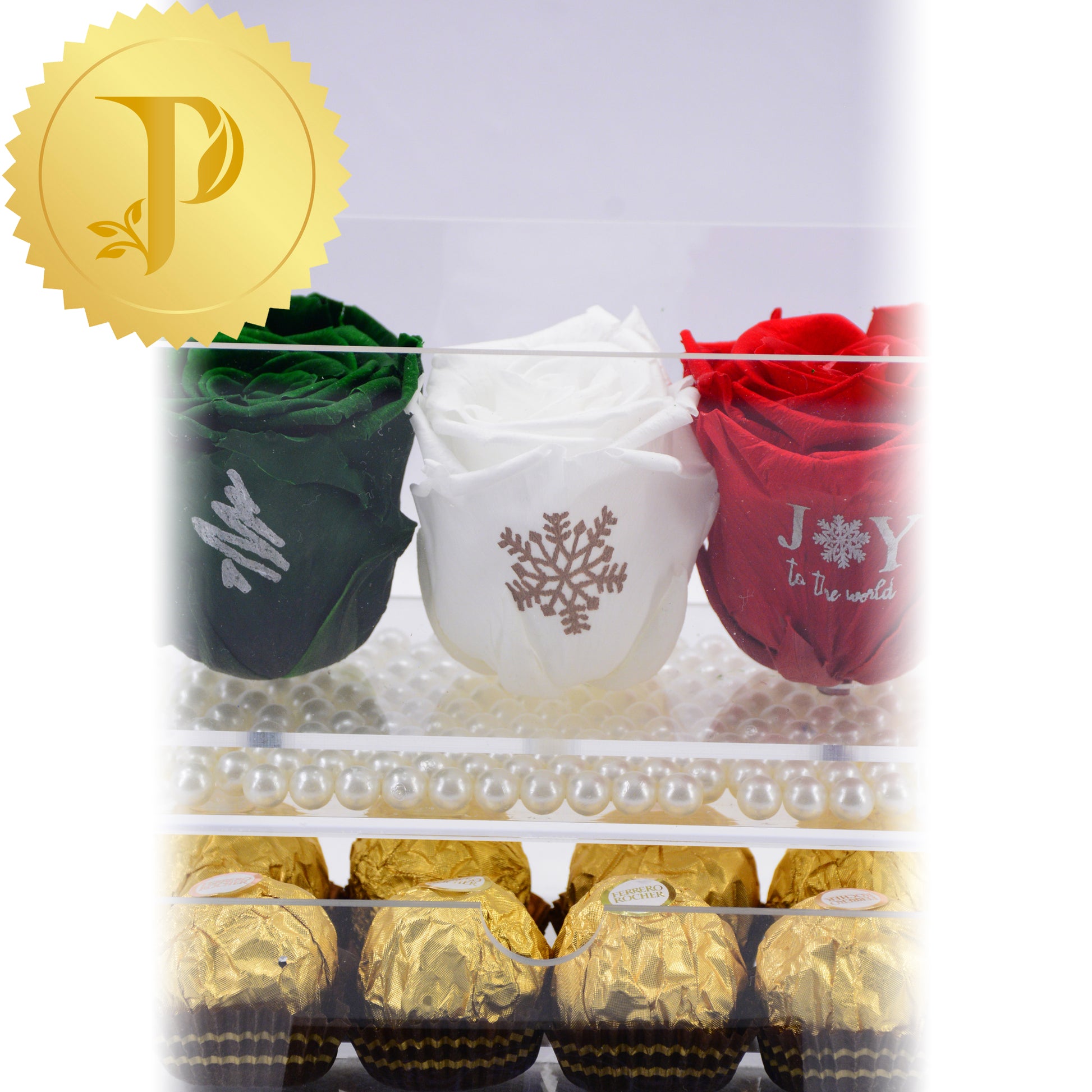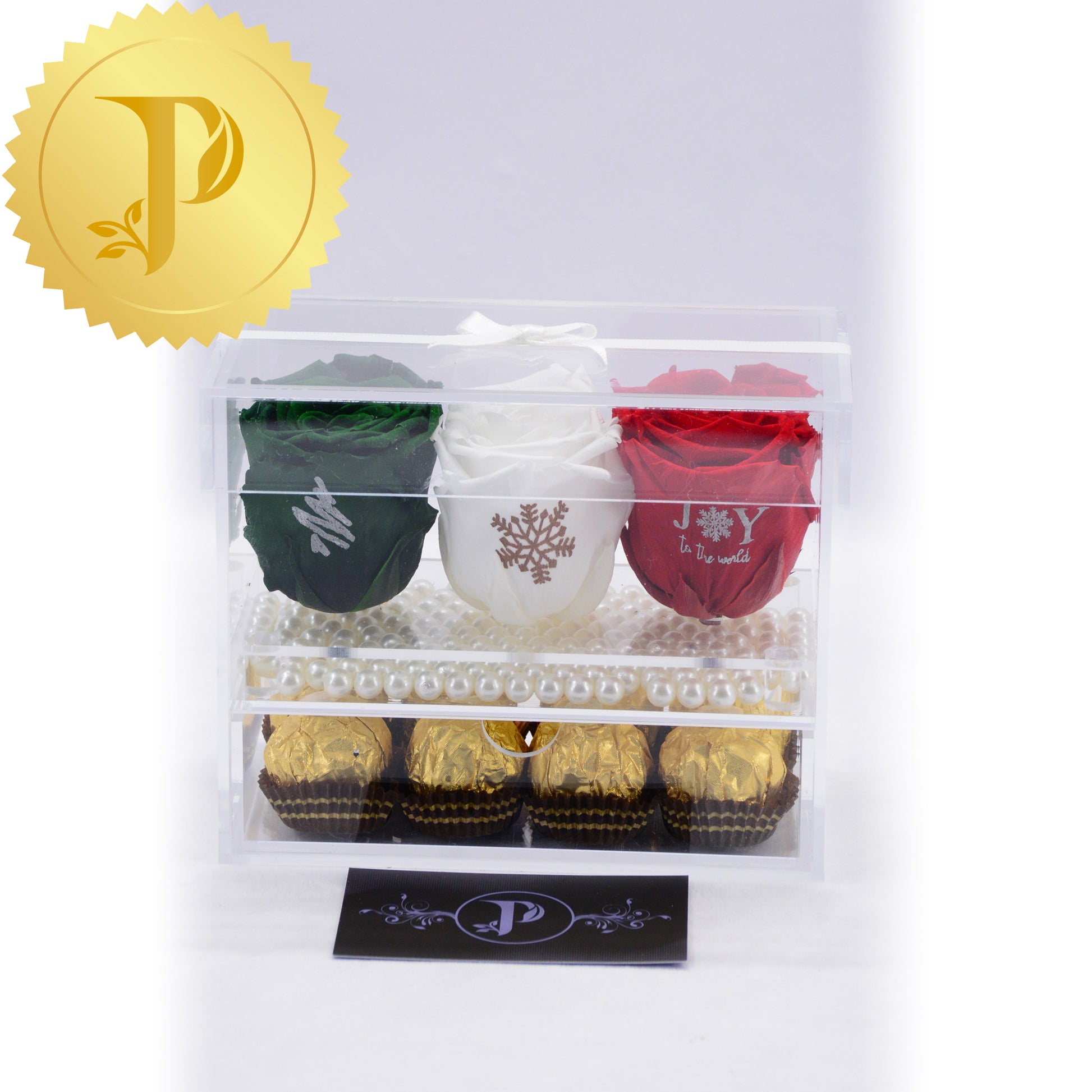 This rose trio in acrylic with green, white and red roses are complemented by a layer of faux white pearls and a drawer filled with Ferrero Rocher chocolates.