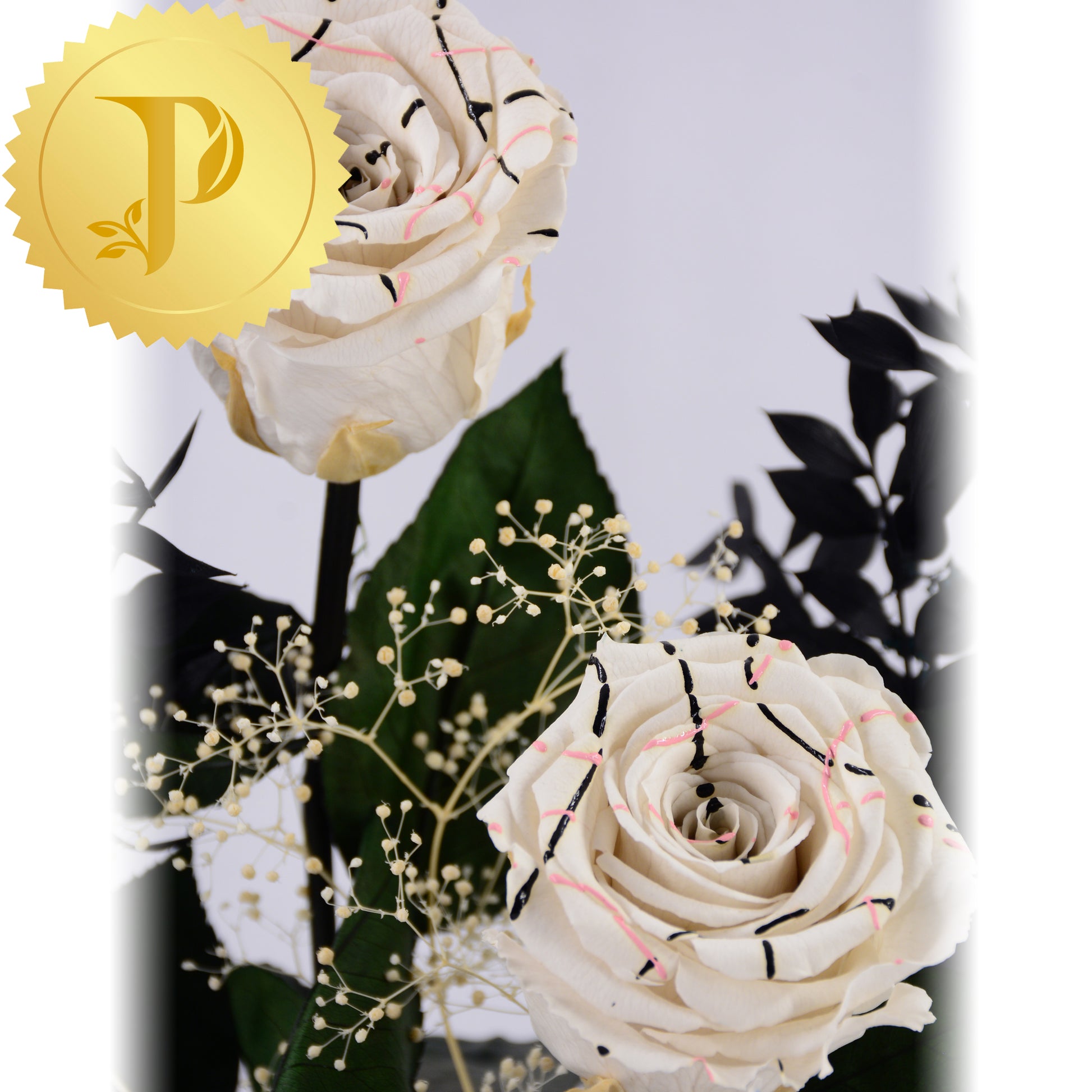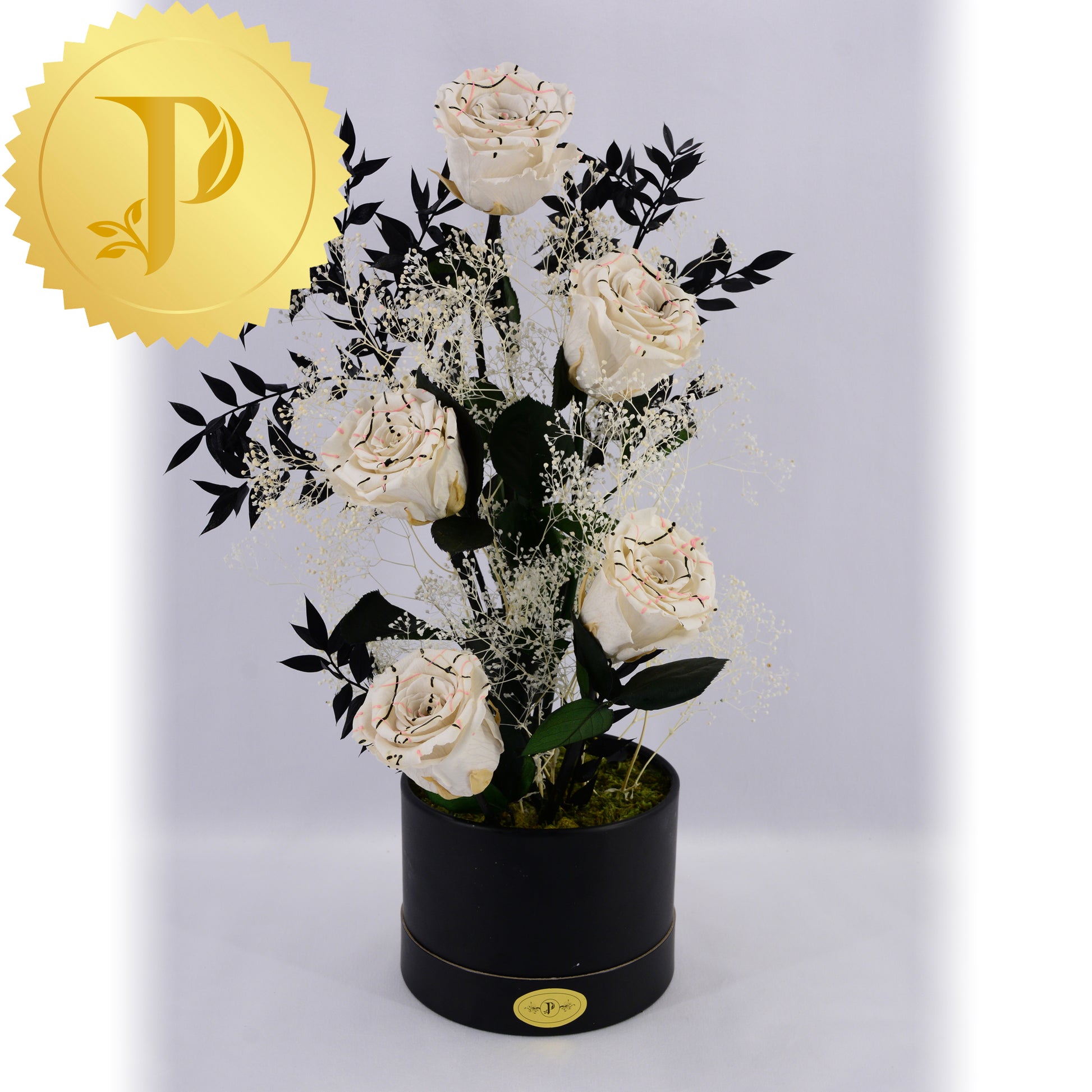 An artistic grouping of five ivory-coloured roses drizzled with pink and black lines, all accented with selected preserved filler. The arrangement is placed in a small round black box, adorned with preserved moss to give a more realistic effect.