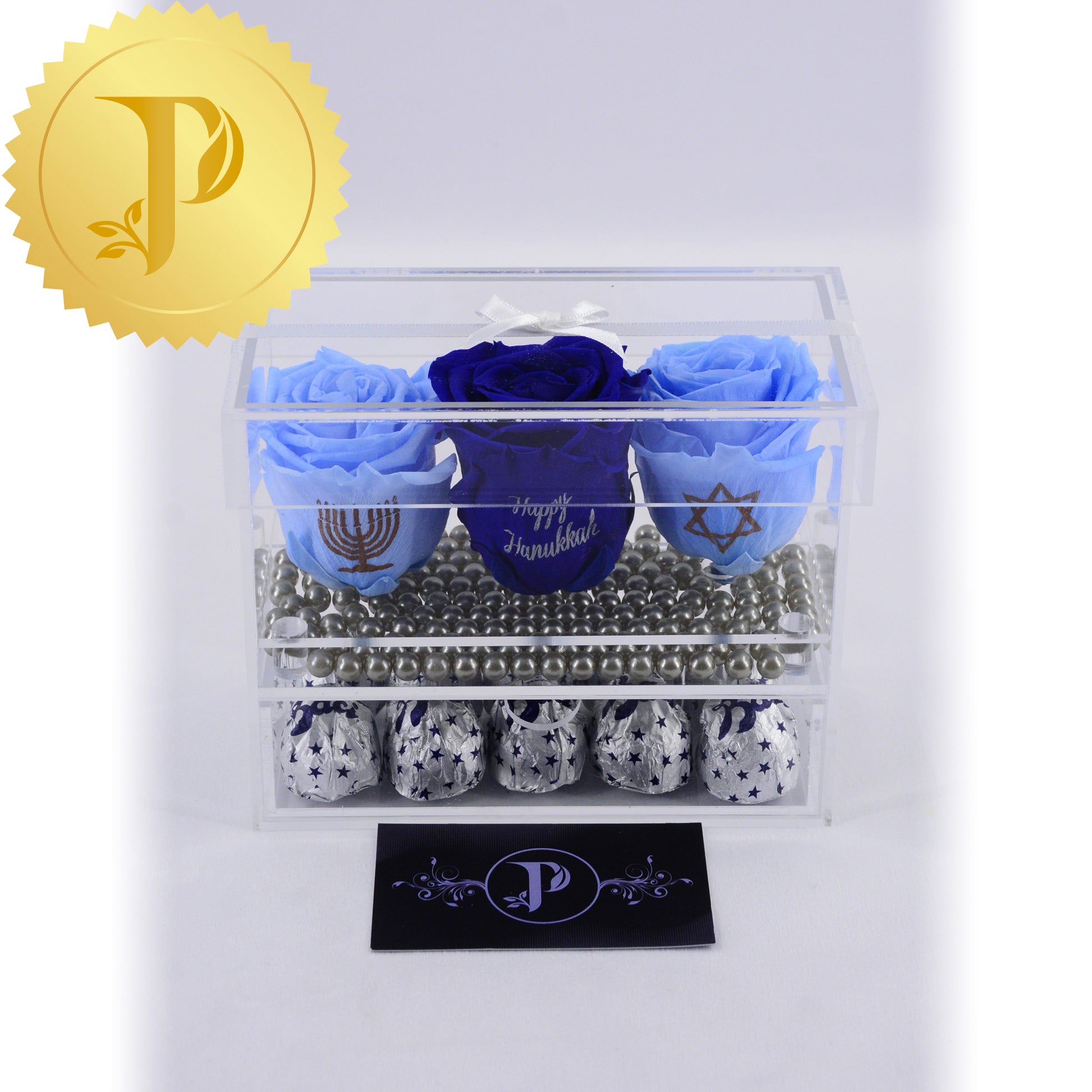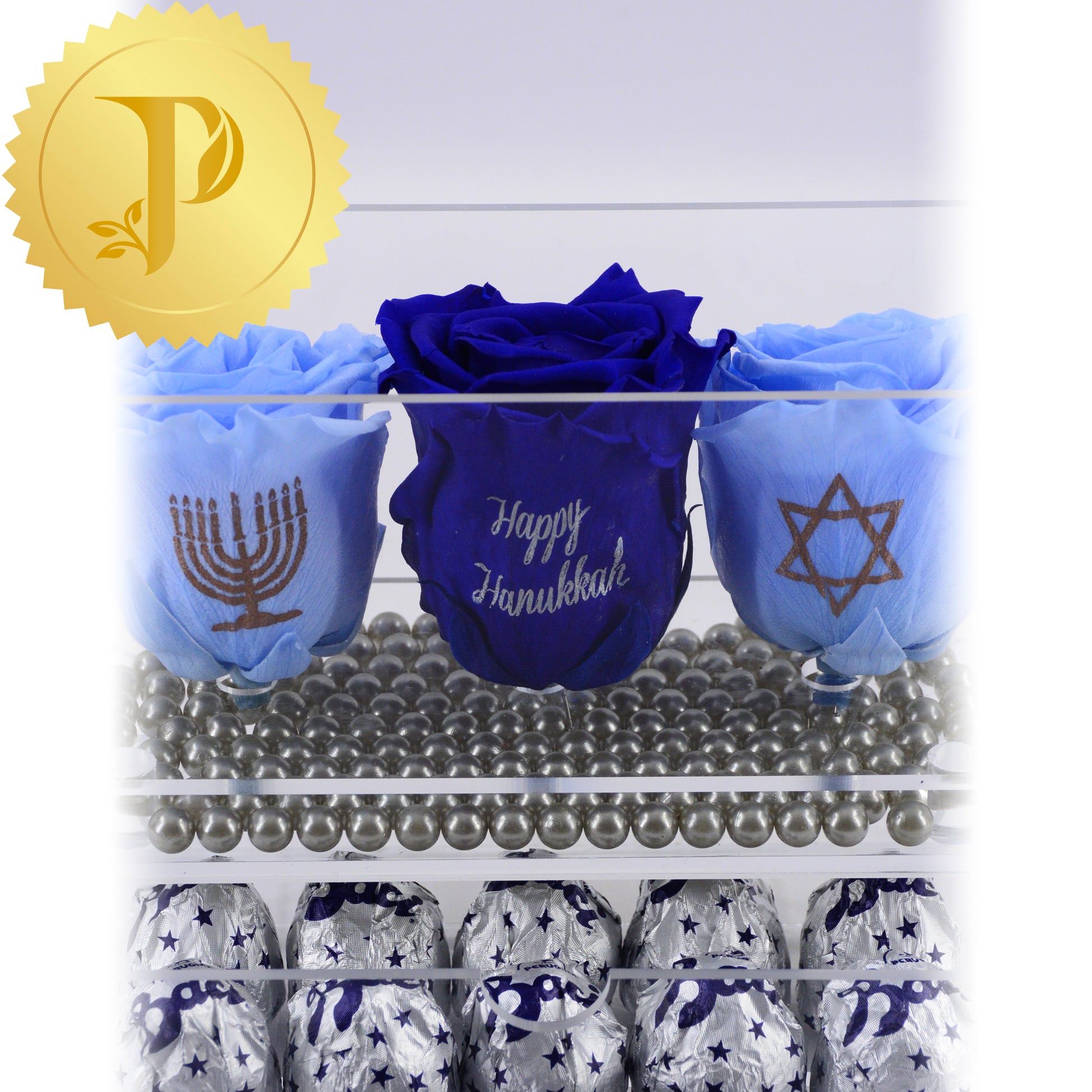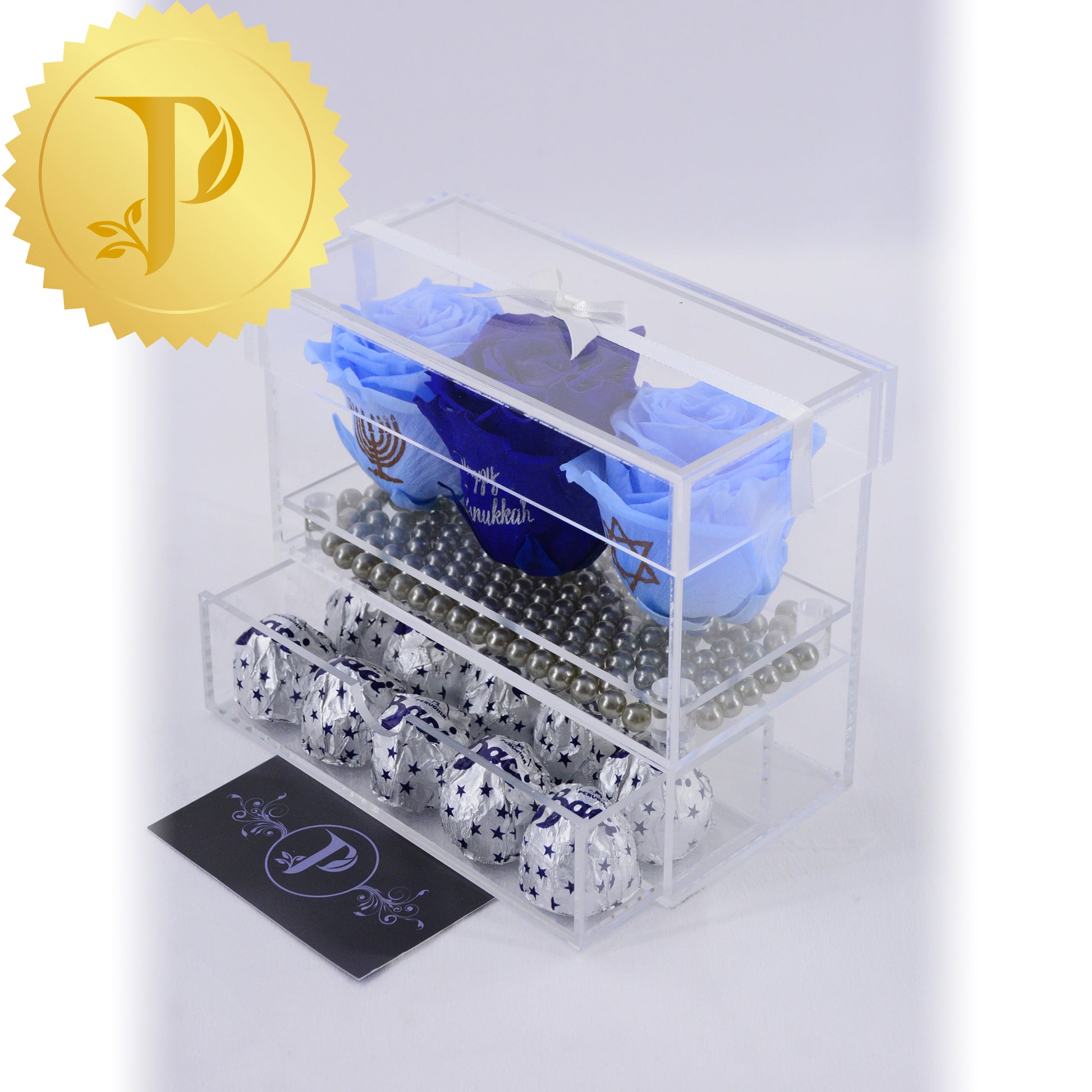 Honour Hanukkah with this rose trio in acrylic with light and royal blue roses are complemented by a layer of faux silver pearls and a drawer filled with Baci chocolates.